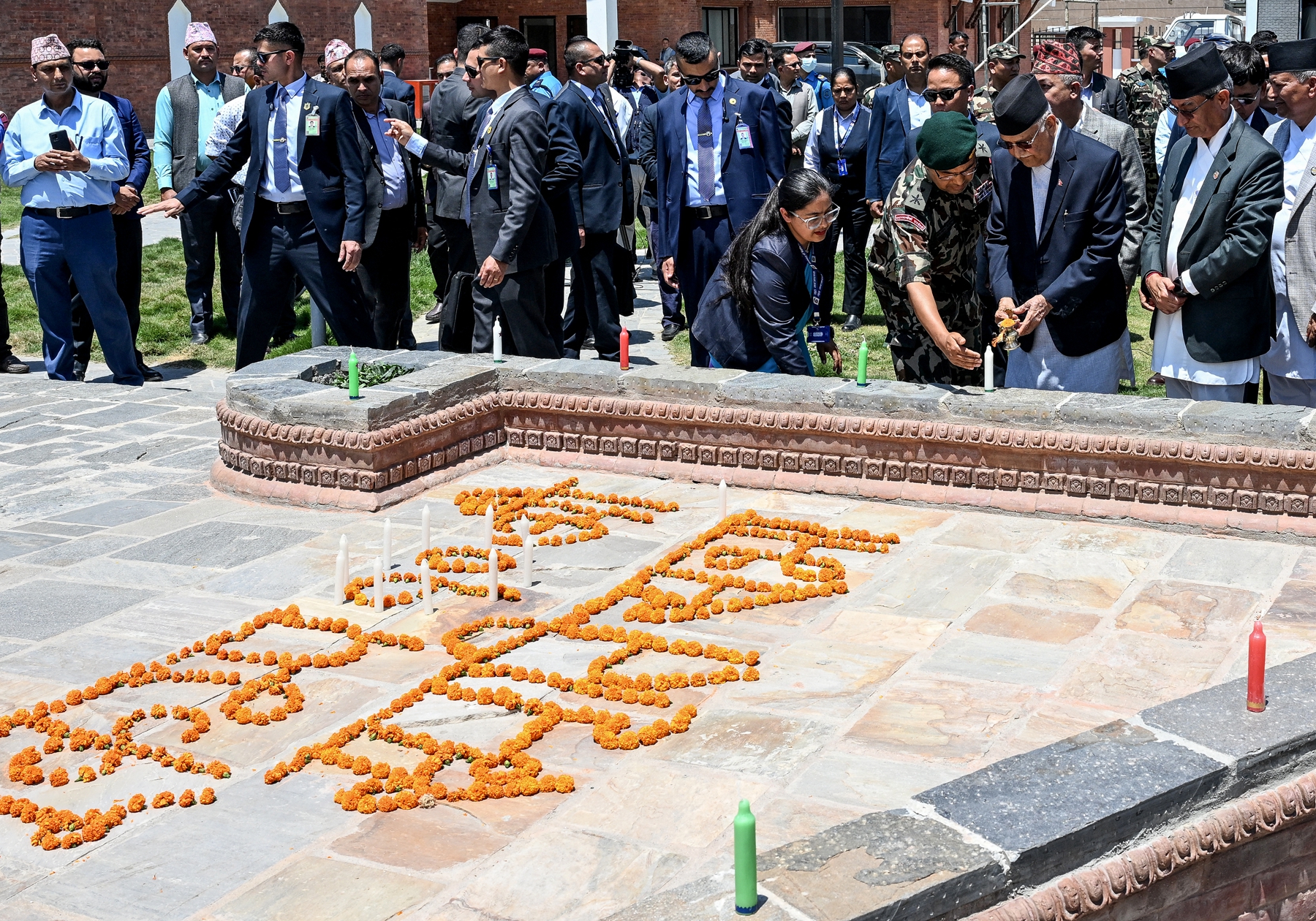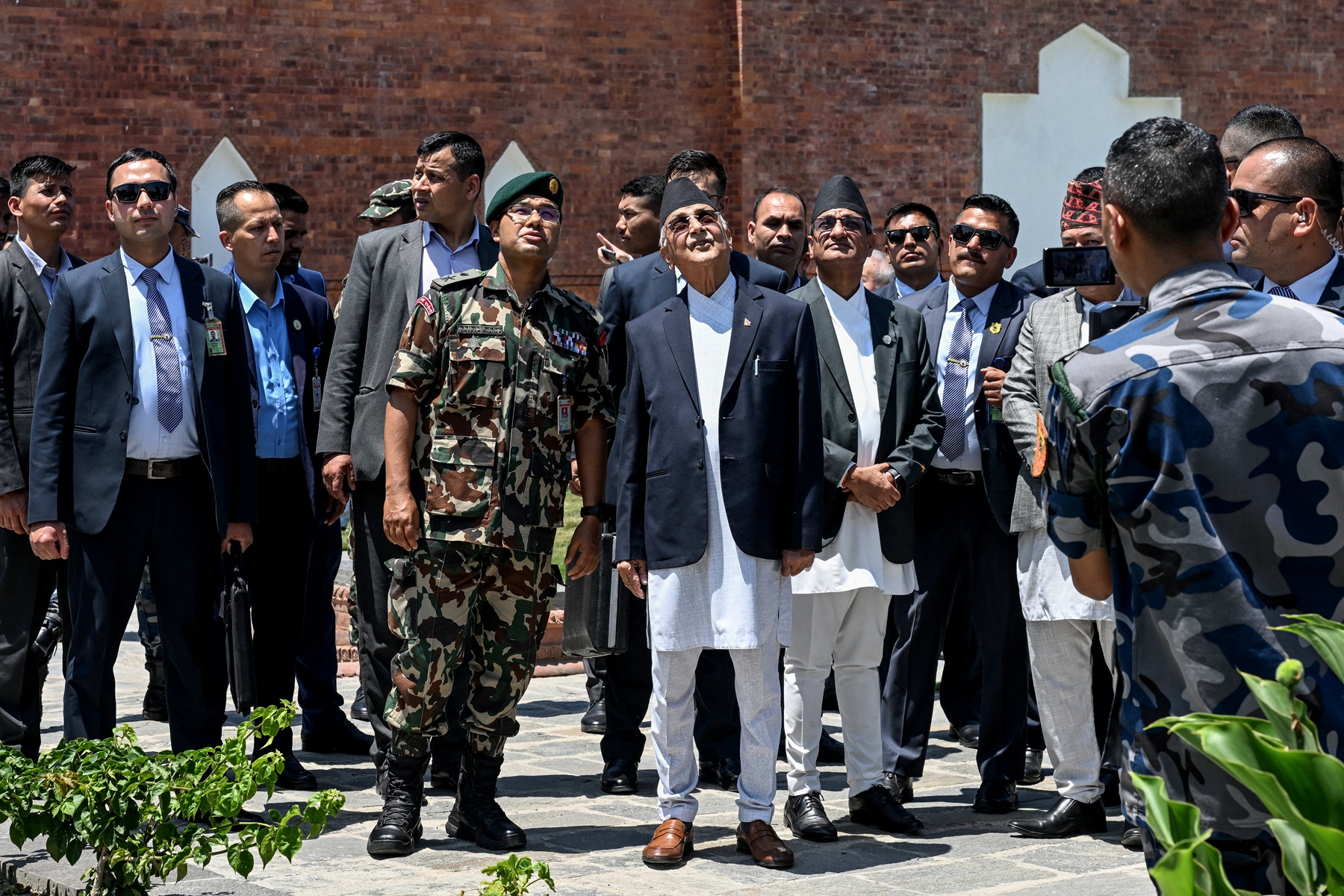 2025年4月25日,即尼泊尔“4.25”大地震十周年之际,尼泊尔总理卡德加‧普拉萨德‧夏尔马‧奥利(KP Sharma Oli,中)率内阁多位部长及多国驻尼使节,抵达加德满都悼念遇难者。(Prakash Mathema/AFP via Getty Images)