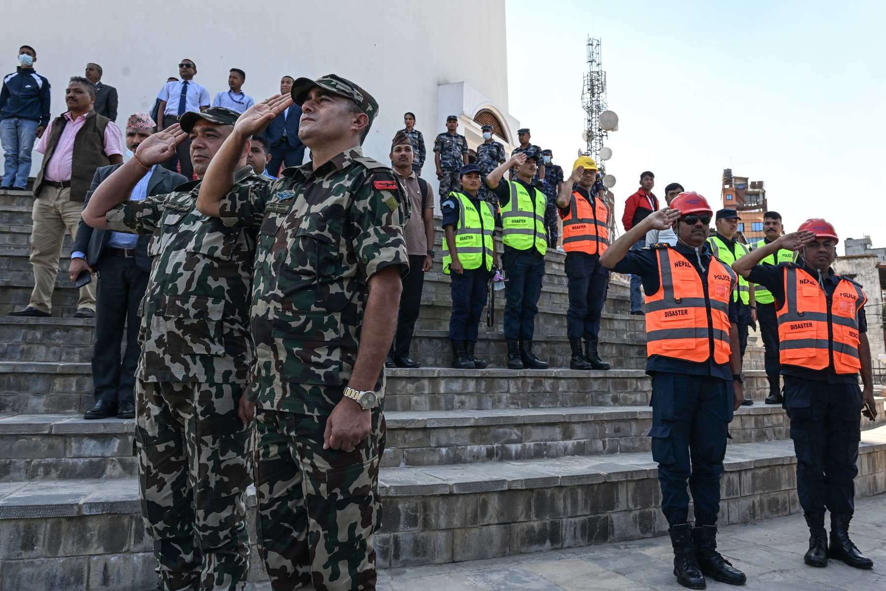 2025年4月25日,即尼泊尔“4.25”大地震十周年之际,尼泊尔军人和警察在加德满都重建后的达拉哈拉塔(Dharahara,又称比姆森塔)下,向当年的地震遇难者致敬。(Prakash Mathema/AFP via Getty Images)