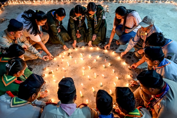 2025年4月25日,即尼泊尔“4.25”大地震十周年之际,尼泊尔民众在加德满都举行烛光守夜活动,悼念当年数千名逝去的生命。 (Prakash Mathema/AFP via Getty Images)