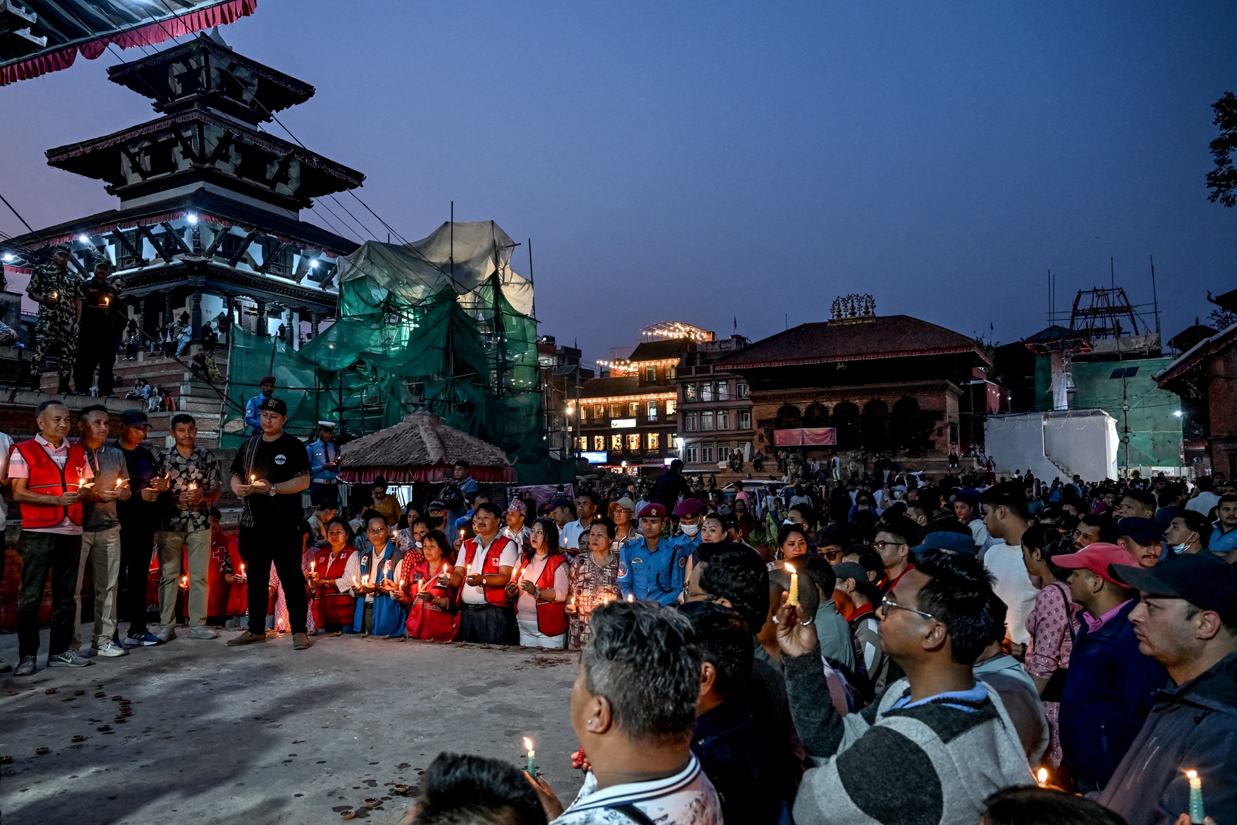 2025年4月25日,即尼泊尔“4.25”大地震十周年之际,尼泊尔民众在加德满都举行烛光守夜活动,悼念当年数千名逝去的生命。(Prakash Mathema/AFP via Getty Images)