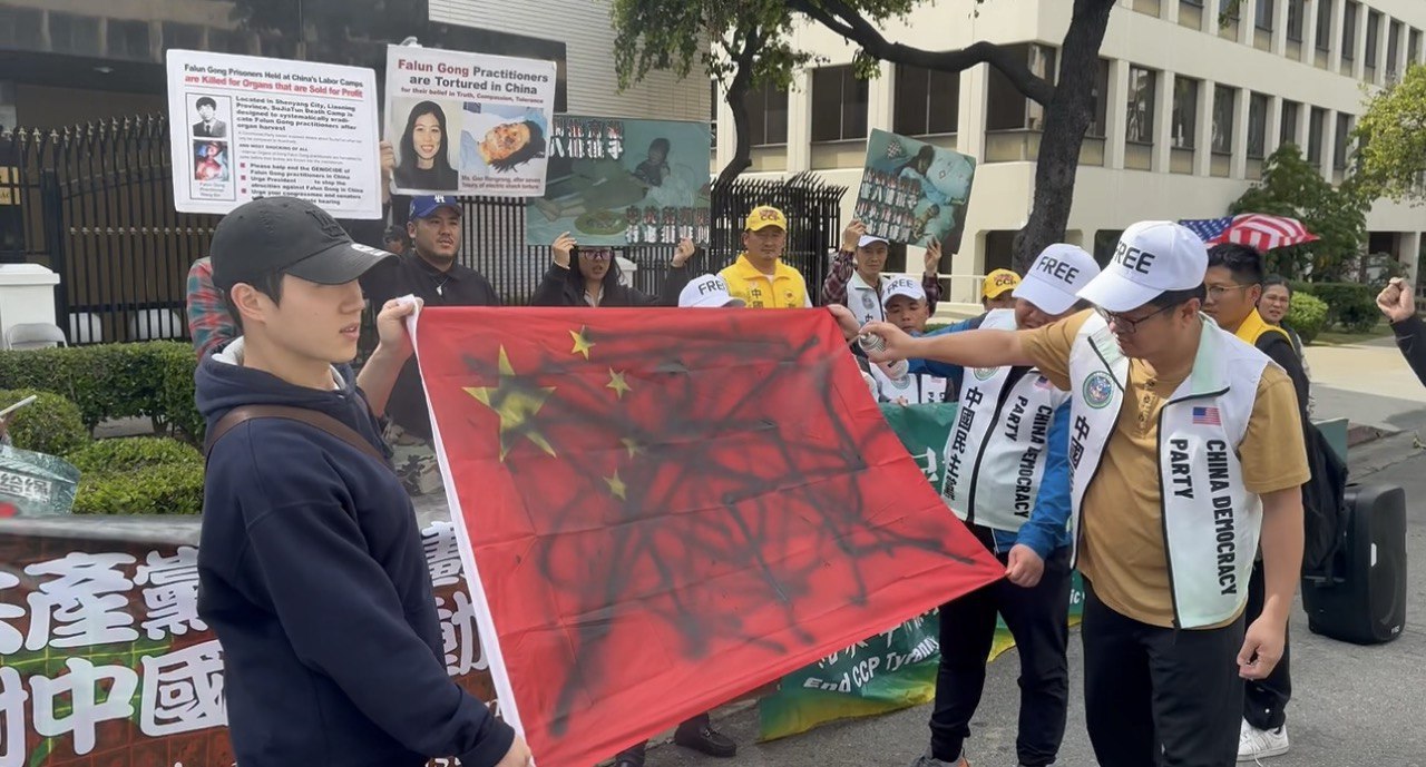 4月27日下午3时至5时,洛杉矶当地的民运组织在中共驻当地领事馆前举行集会游行抗议活动。