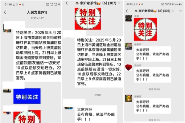 【大纪元2025年05月26日讯】(大纪元记者骆亚采访报导)近日上海一位女访民、海军军官后代桂珊红前往北京上访,被驻京办人员押回上海关进黑监狱后失联,次日被送医院抢救,宣告死亡。消息在访民中引起震惊,他们呼吁调查、严惩凶手。但官方严控消息。