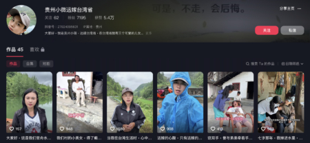今年4月,因在台湾公开鼓吹“武统”而被强制驱逐出境的陆配“小微”,回到了贵州铜仁市沿河县官舟镇新场村的老家。她随即在抖音上开设新账号,在记录当地农村生活的同时,还时常发表有关“一个中国”的亲共言论以吸引流量。