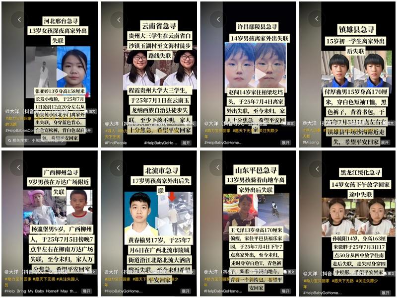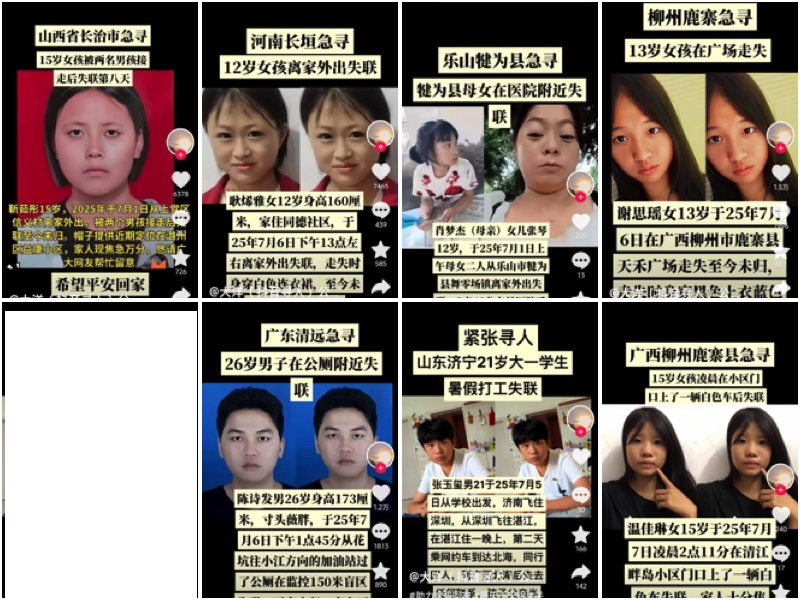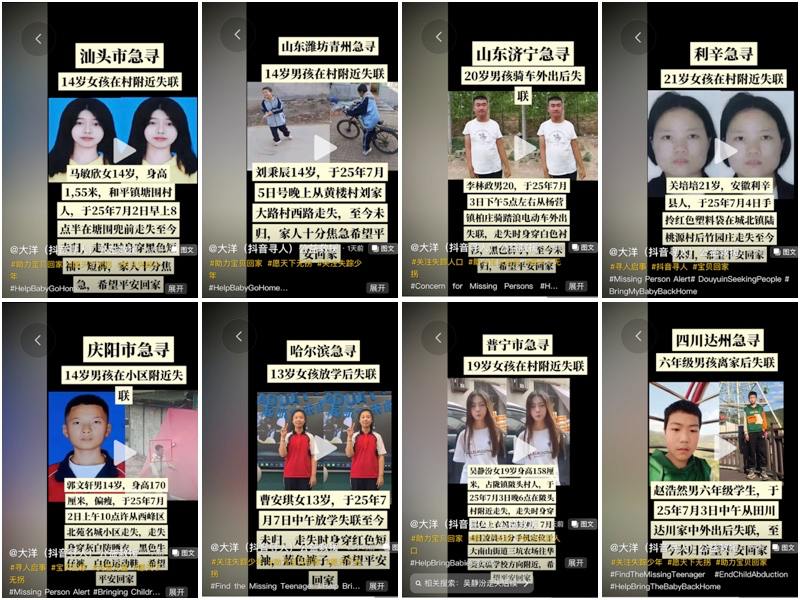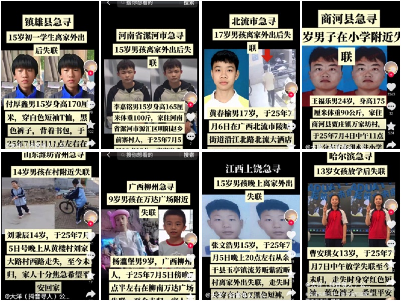 大陆老牌寻亲网被关闭后,人们现在通过各社交平台上向外发送寻人启事,根据抖音上一个自媒体账号发出的寻人启事来看,从7月1日至7日一周时间内,就有全国各地31条青少年失踪的信息。