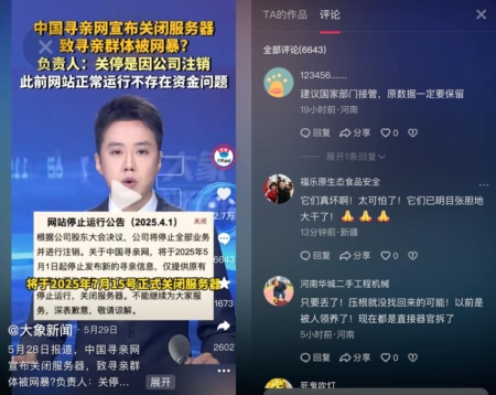 【大纪元2025年07月16日讯】(大纪元记者骆亚采访报导)7月15日,运行25年的中国寻亲网彻底关闭服务器并注销公司。在中共规定器官移植条例、捐献器官宣传进入校园,尤其器官来源不透明情况下,寻亲网关闭引起社会广泛担忧,网友表示细思极恐,失踪青少年或成为活供体。