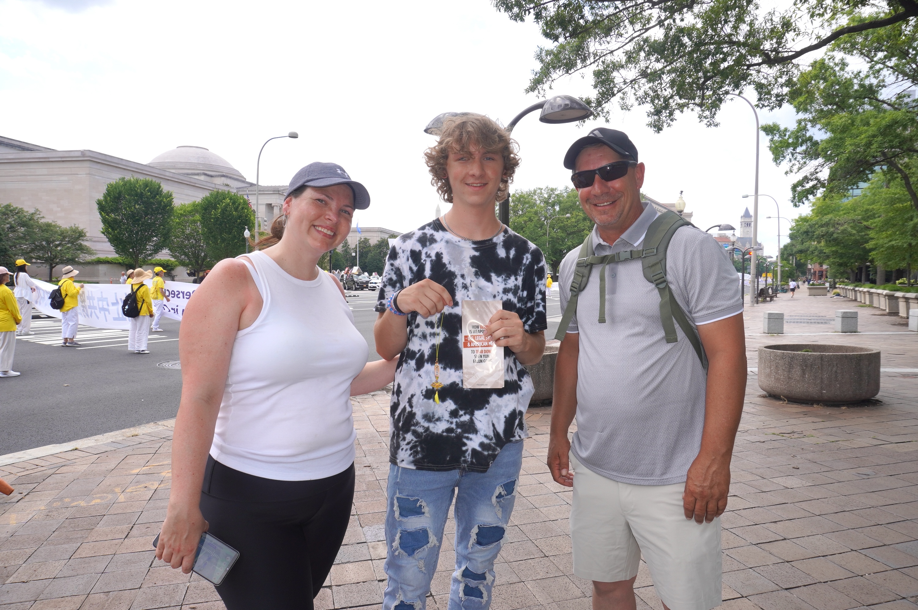 2025年7月17日,来自纽约州首府奥尔巴尼一所公立学校的建筑维护技术员Timothy Call(右)和妻子Ariel、继子Dylan Maxwell观看了法轮功华府大游行。(李辰/大纪元)