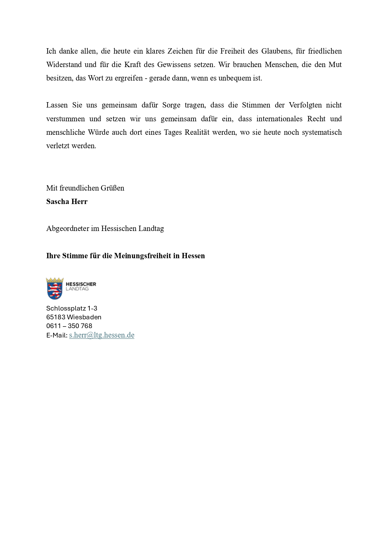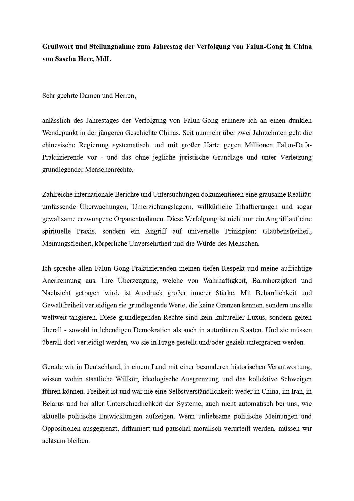 法轮功学员当天的活动也获得黑森州州议员萨希阿‧赫尔(Sascha Herr)的支持。他在信件中写道:法轮功遭受迫害周年之际,让他想起当代中国历史上的一个黑暗转折点——“二十多年来,中国(中共)政府对百万法轮功修炼者进行系统性的严厉打压。此举没有任何法律依据,也公然侵犯了基本人权。”