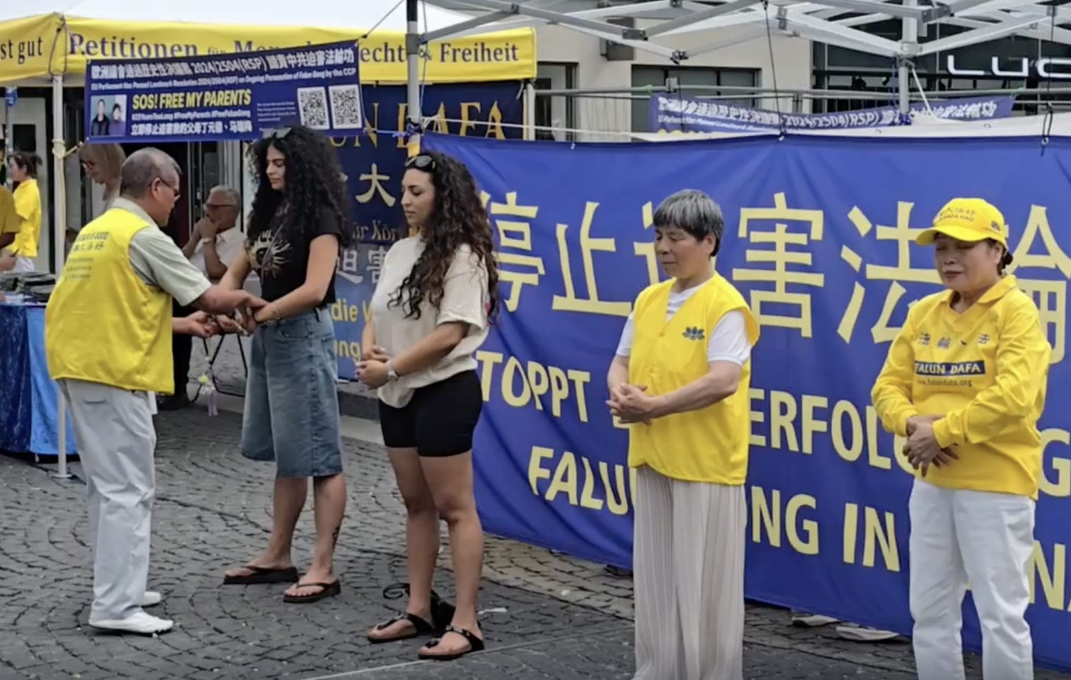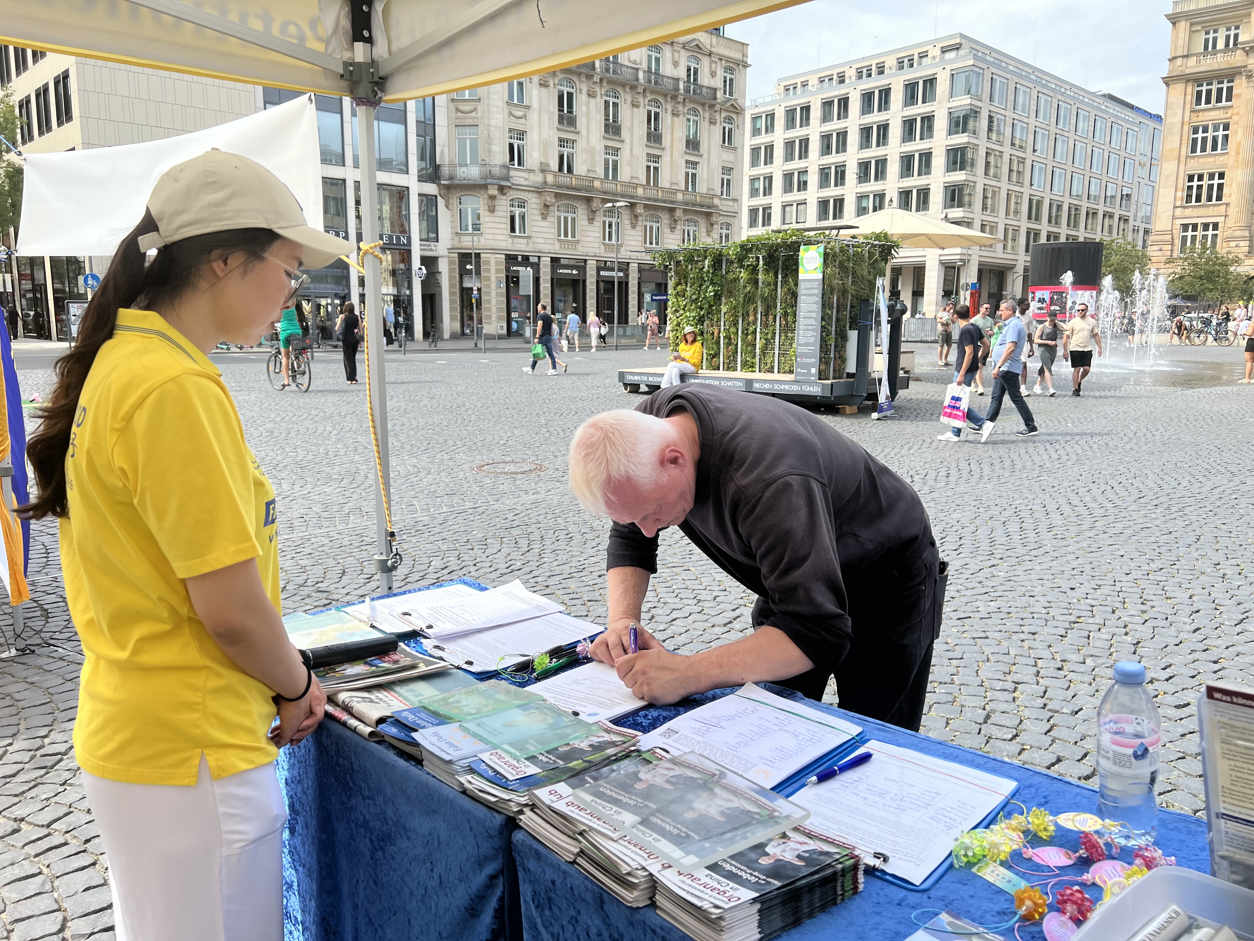 当天来参加活动的还有三位前不久才从中国长春逃亡至德国的法轮功学员。他们在德国外地学员的帮助下,一道驱车数小时赶到法兰克福。他们在中国国内亲历了中共的迫害,或失去了亲人,或失去了亲密的同修,或被骚扰、绑架、关押。
