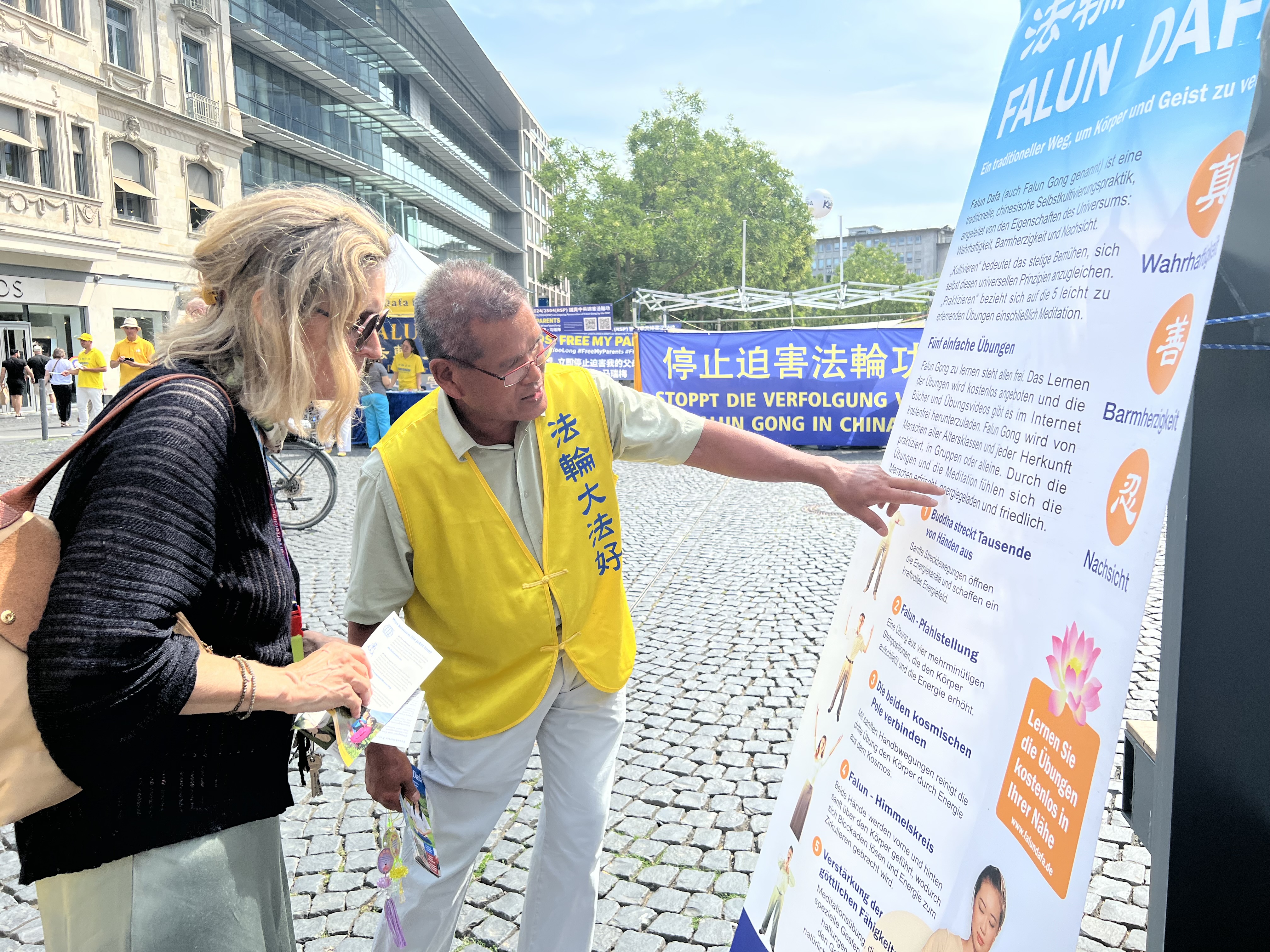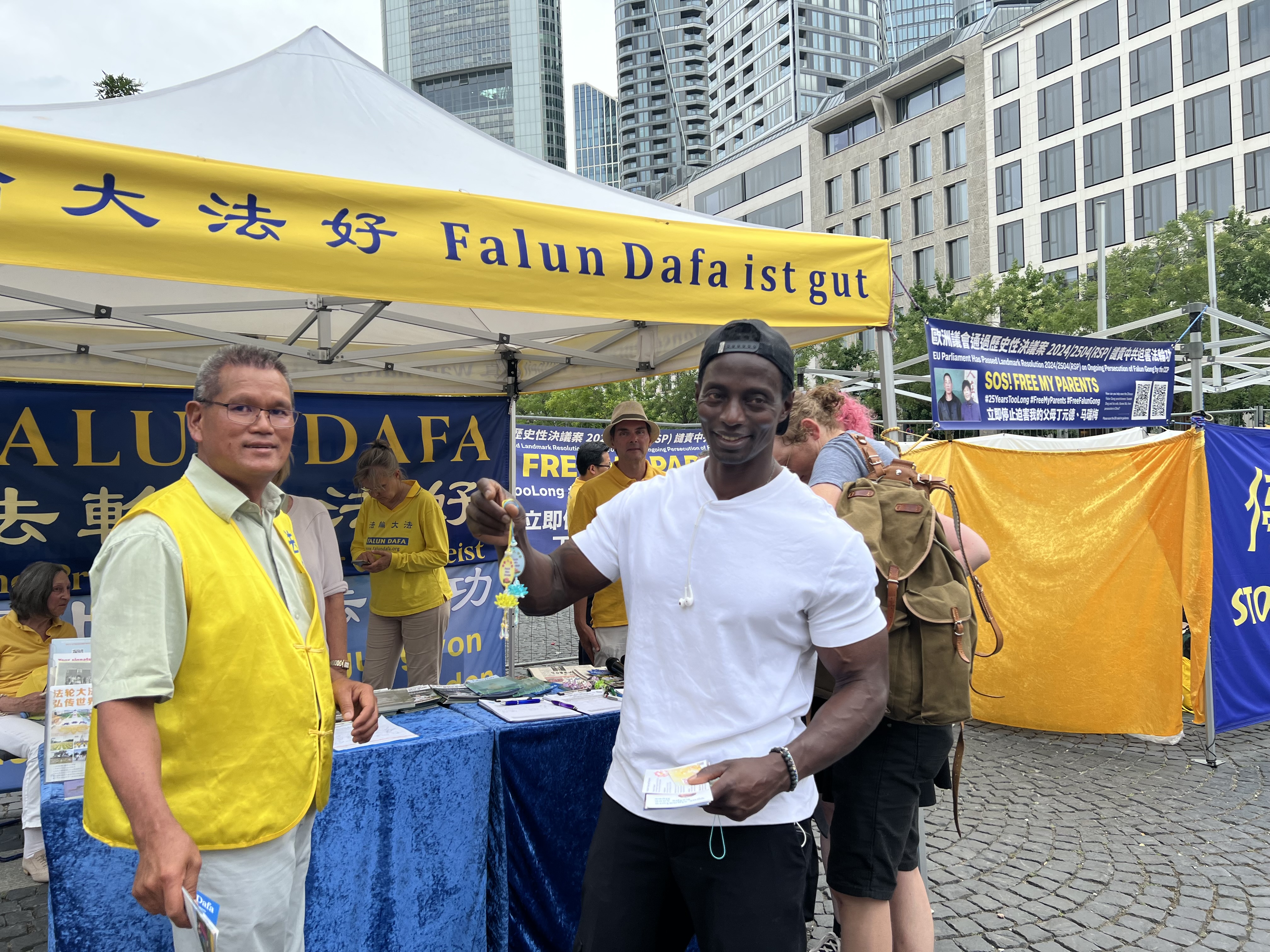 还有不少人表示对法轮功功法很感兴趣,有两位年轻女士当场就跟着学员学炼功法。有一位来自非洲的男子是第一次听说了法轮功真相,他说:“我想学炼法轮功”,并表示他明天就到法兰克福的法轮功炼功点去学功。还有一位德国女士一直在静静地观看学员们炼功,并听一位学员给她详细讲解功法动作。