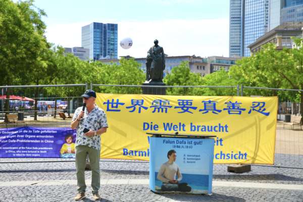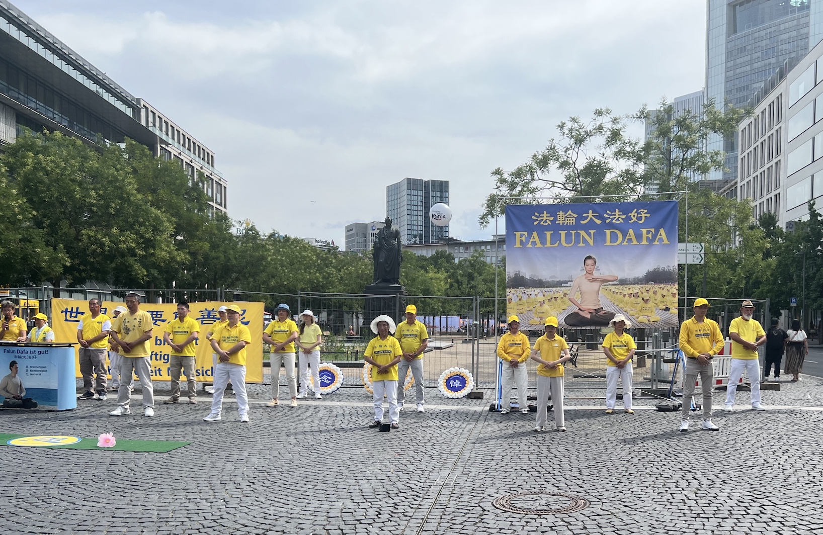 【大纪元2025年07月16日讯】(大纪元记者李洁思报导)7月19日,德国法兰克福及周边的法轮功学员在该市著名的歌德广场(Goetheplatzu)举行了法轮功反迫害26周年的集会活动。欧洲议会的德国资深议员迈克尔‧盖勒(Michael Gahler)亲临现场发言支持。该市居民及游人被法轮功学员传达的信息及平和的功法展示所吸引,并签名支持法轮功反迫害。