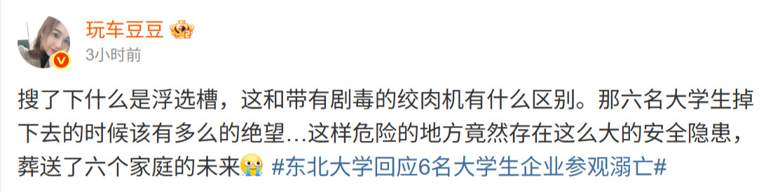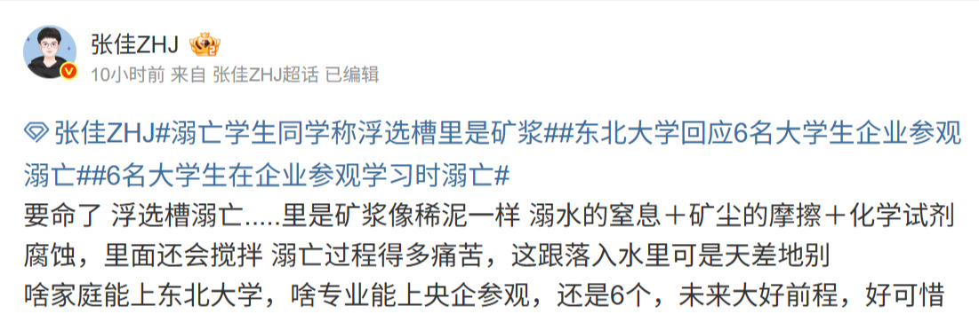 “搜了下什么是浮选槽,这和带有剧毒的绞肉机有什么区别。那六名大学生掉下去的时候该有多么的绝望……这样危险的地方竟然存在这么大的安全隐患。”“浮选槽溺亡…..里面是矿浆像稀泥一样,溺水的窒息+矿尘的摩擦+化学试剂腐蚀,里面还会搅拌,溺亡过程得多痛苦,这跟落入水里可是天差地别。”