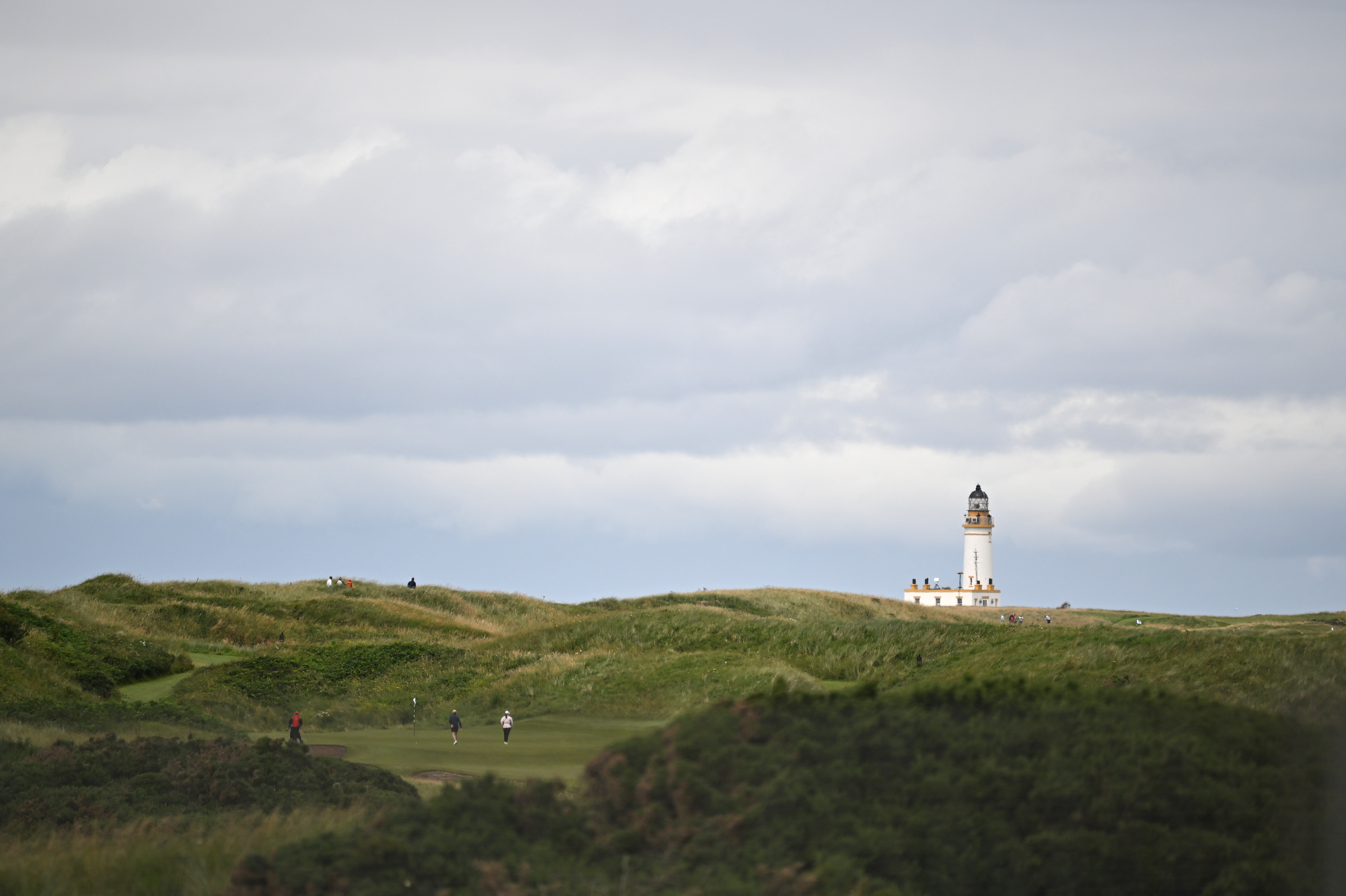 2025年7月25日,苏格兰西南沿海的川普‧坦伯利高尔夫球场(Trump Turnberry Golf Courses)内,一座灯塔映入镜头。美国总统川普(特朗普,Donald Trump)预计当天抵达苏格兰,展开结合外交、商务与休闲的四天行程。(Andy Buchanan/AFP)