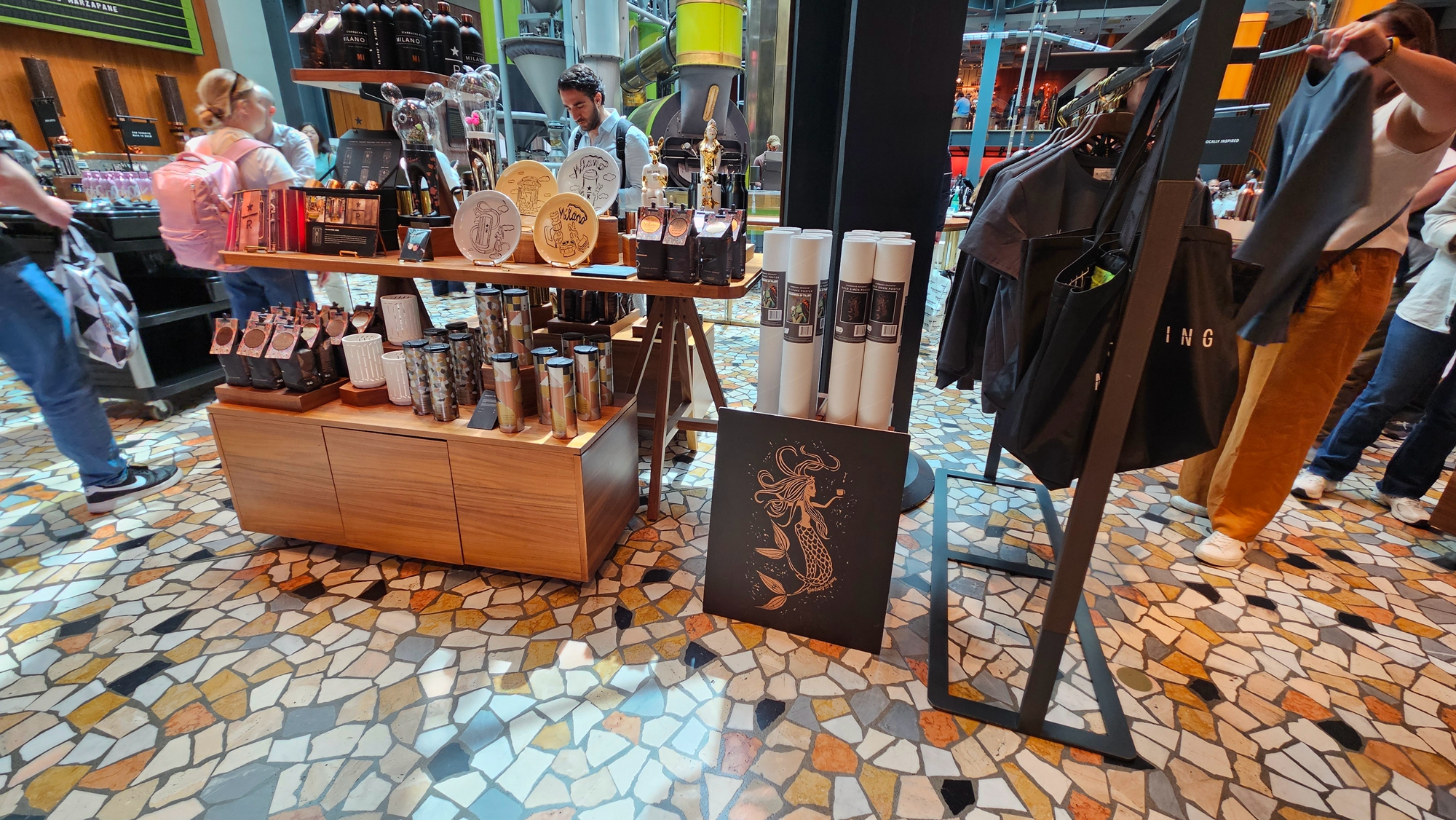 一台巨型的鲜绿色青铜咖啡烘焙机(约6.7米高)占据了店面的中心位置,消费者可以一边品尝美味的咖啡,一边360度无死角地欣赏咖啡豆从生豆烘焙、分装,再到冲制出咖啡的全过程。