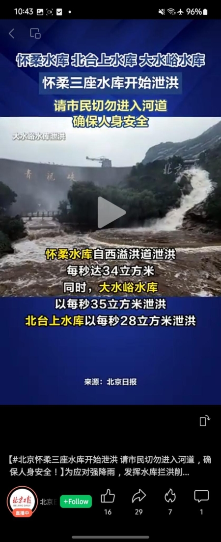 据《北京日报》报导,北京的怀柔区受灾较为严重,27日当天至少三座水库泄洪,包括怀柔水库、北台上水库、大水峪水库。