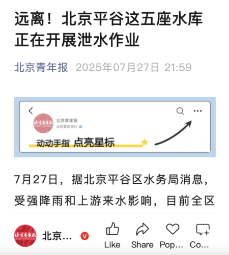 另外,27日北京平谷区有五座水库泄洪,《北京青年报》当晚报导时,罕见用“泄水作业”来代替泄洪。