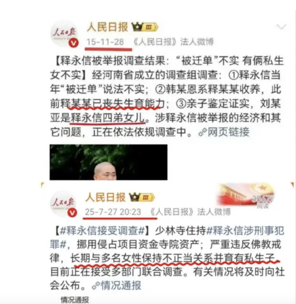 【大纪元2025年07月30日讯】(大纪元记者宁海钟综合报导)少林寺主持释永信日前被调查,罪名之一是他长期与多名女性保持不正当关系并育有私生子,令社会哗然。而十年前释永信就被举报同样问题,但官方介入调查后给予洗白,并曾称释永信无生育能力,中共《人民日报》也报导过。有网民往北京打电话举报《人民日报》当年造谣。