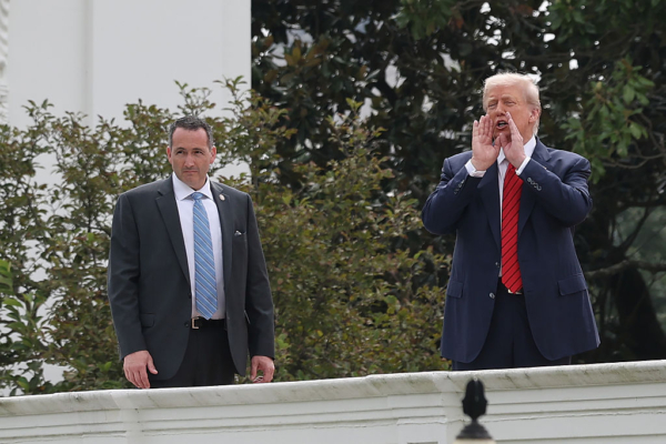 美联社报导,周二(8月5日)上午晚些时候,川普从通往国宴厅的一扇门走出来,登上新闻发布室和环绕玫瑰园的西侧柱廊上方的屋顶。他花了近20分钟视察屋顶和下面的庭院,包括新铺设的玫瑰园。
