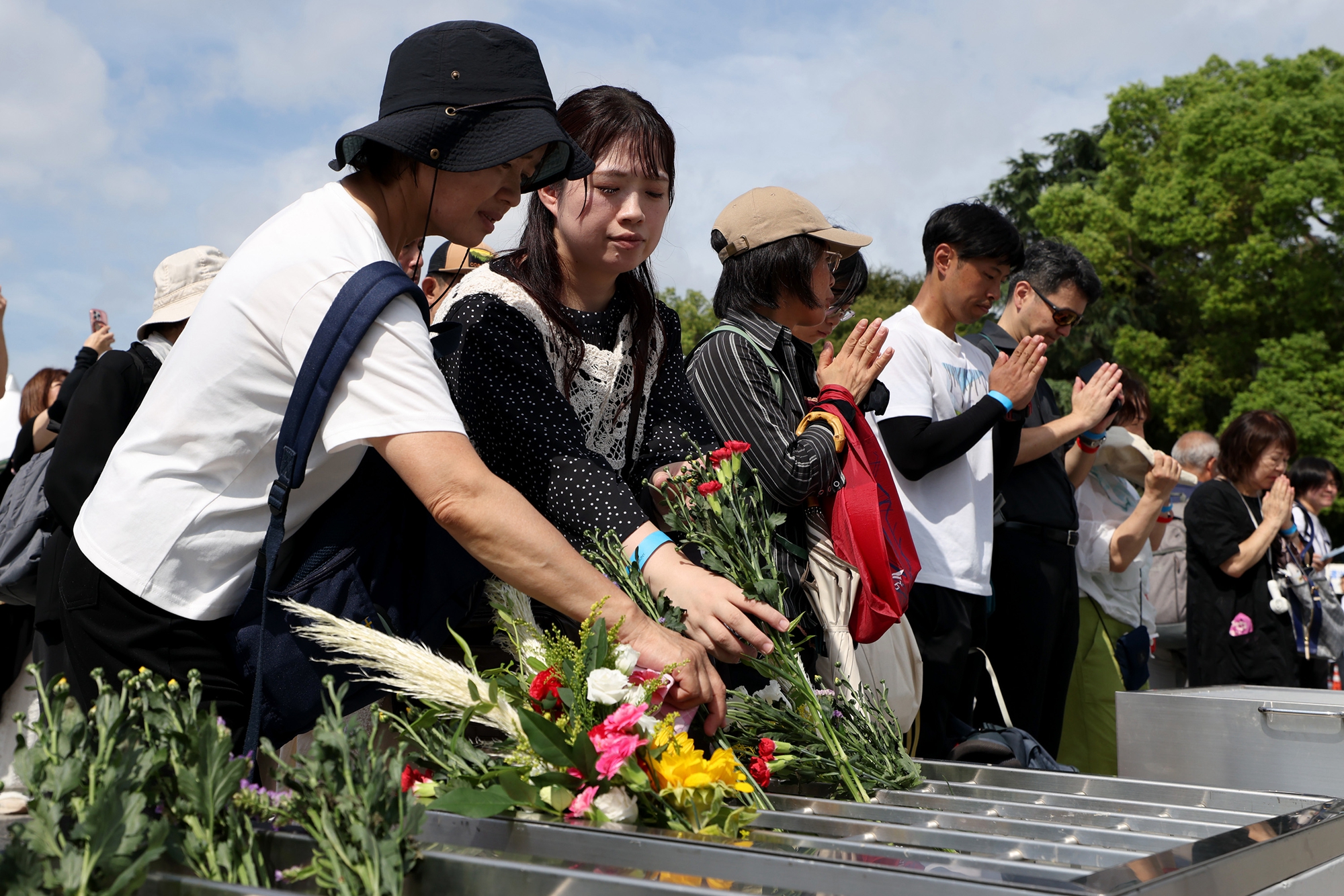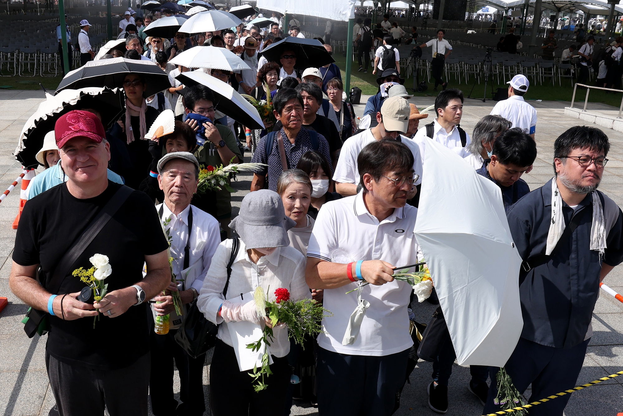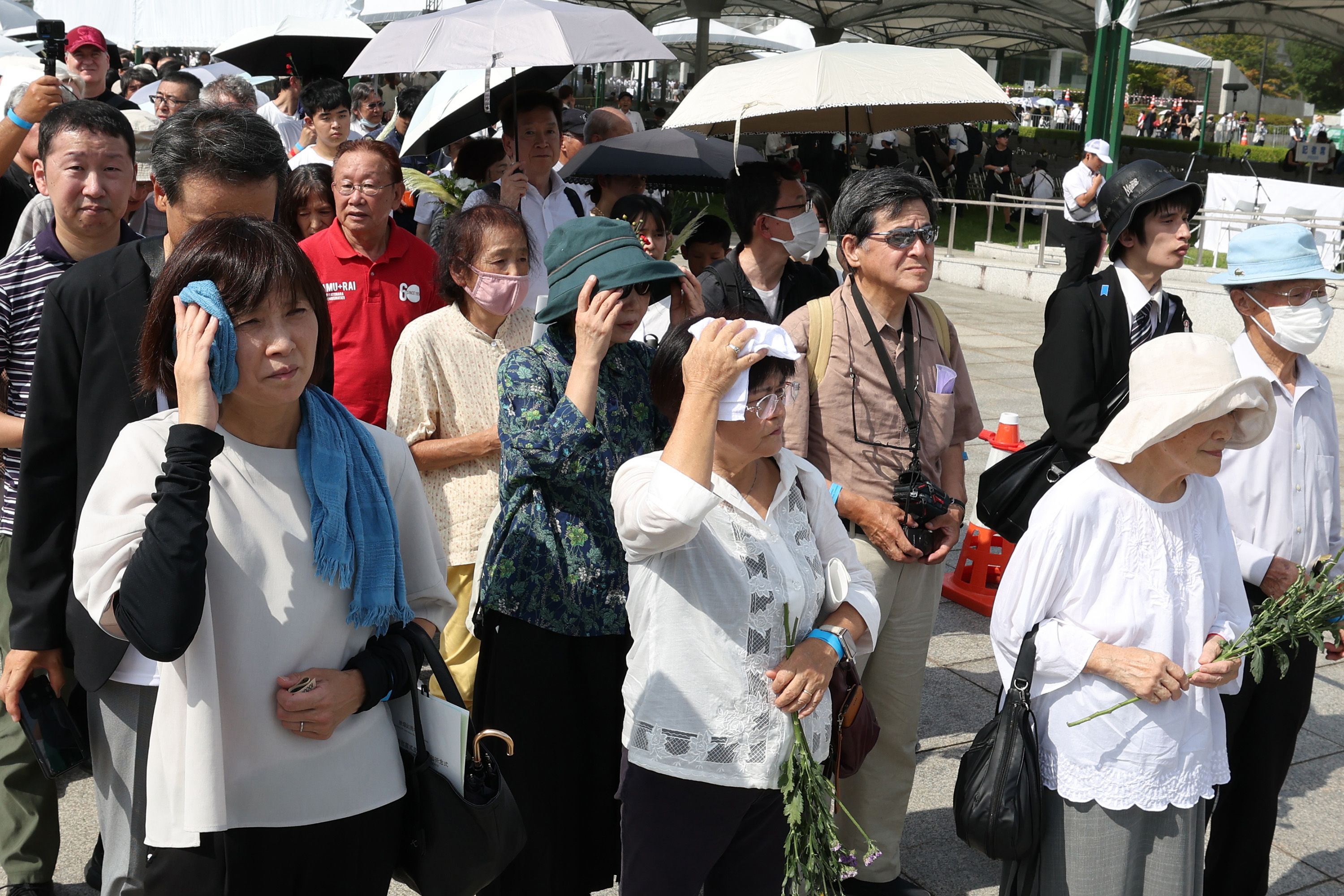 广岛和平纪念公园于今天早上8时开始举行纪念仪式。8时15分,即80年前美军B-29轰炸机“艾诺拉‧盖”号在广岛上空投下世界上第一颗原子弹的那一刻,所有出席者一起低头默哀。