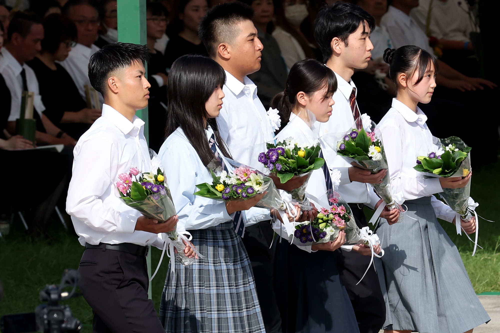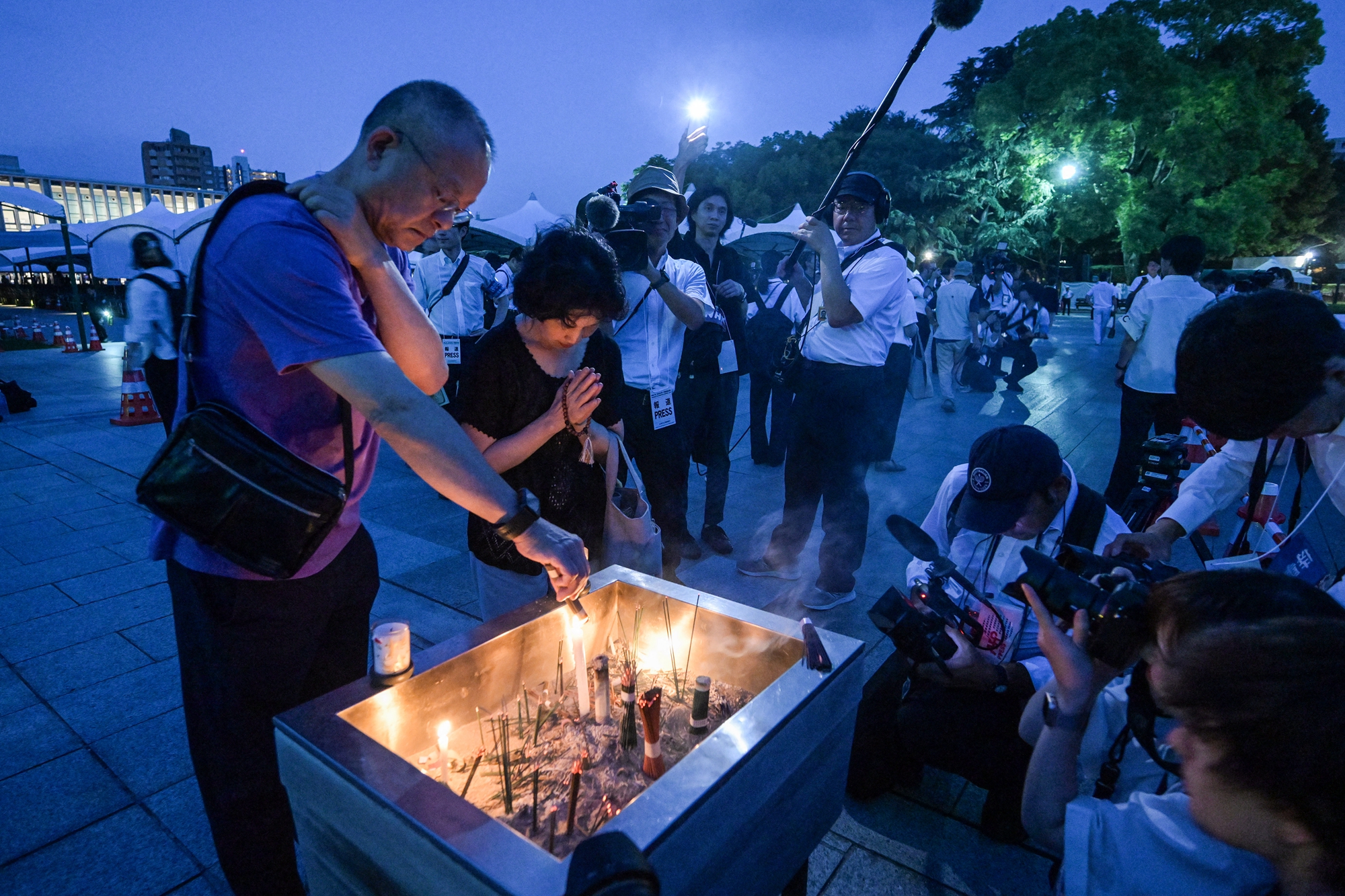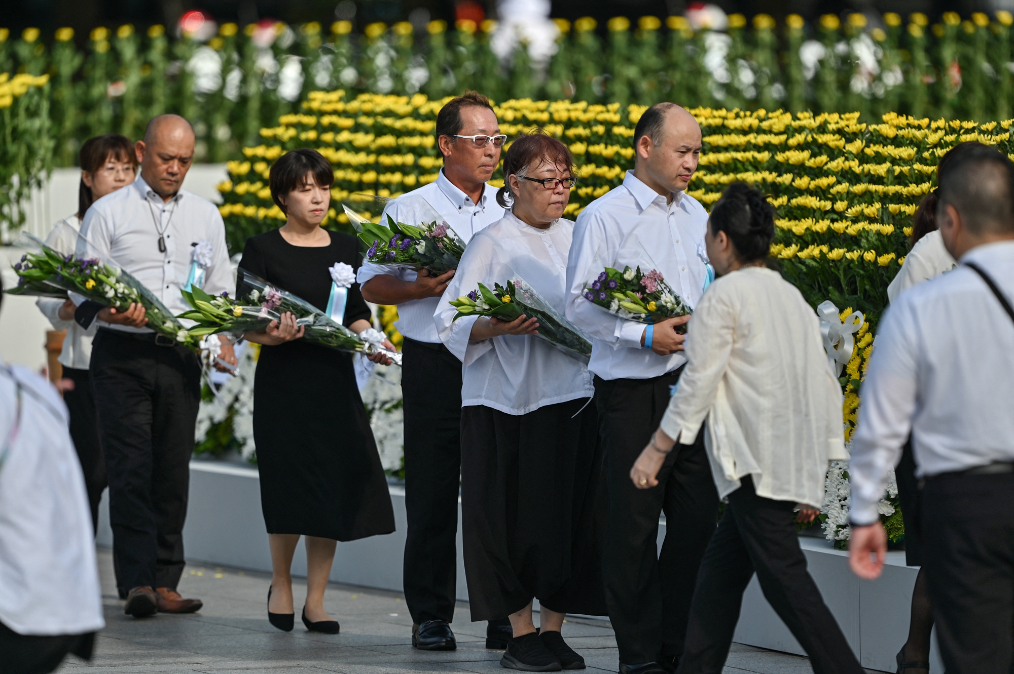广岛和平纪念公园于今天早上8时开始举行纪念仪式。8时15分,即80年前美军B-29轰炸机“艾诺拉‧盖”号在广岛上空投下世界上第一颗原子弹的那一刻,所有出席者一起低头默哀。