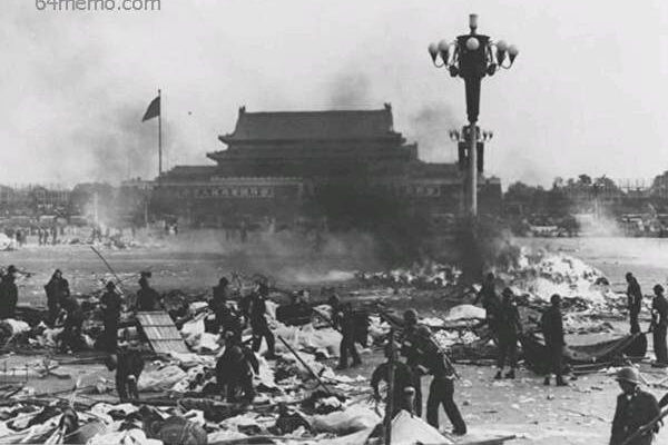 1989年6月4日,北京天安门广场一片狼藉,几名中共士兵在进行清理工作。公民记者周曙光于2007年6月17日翻拍,于2012年6月3日上传flickr。(周曙光/CC BY-NC-SA 2.0.)