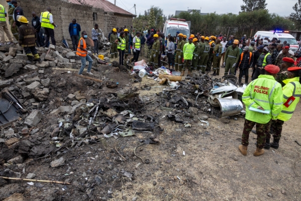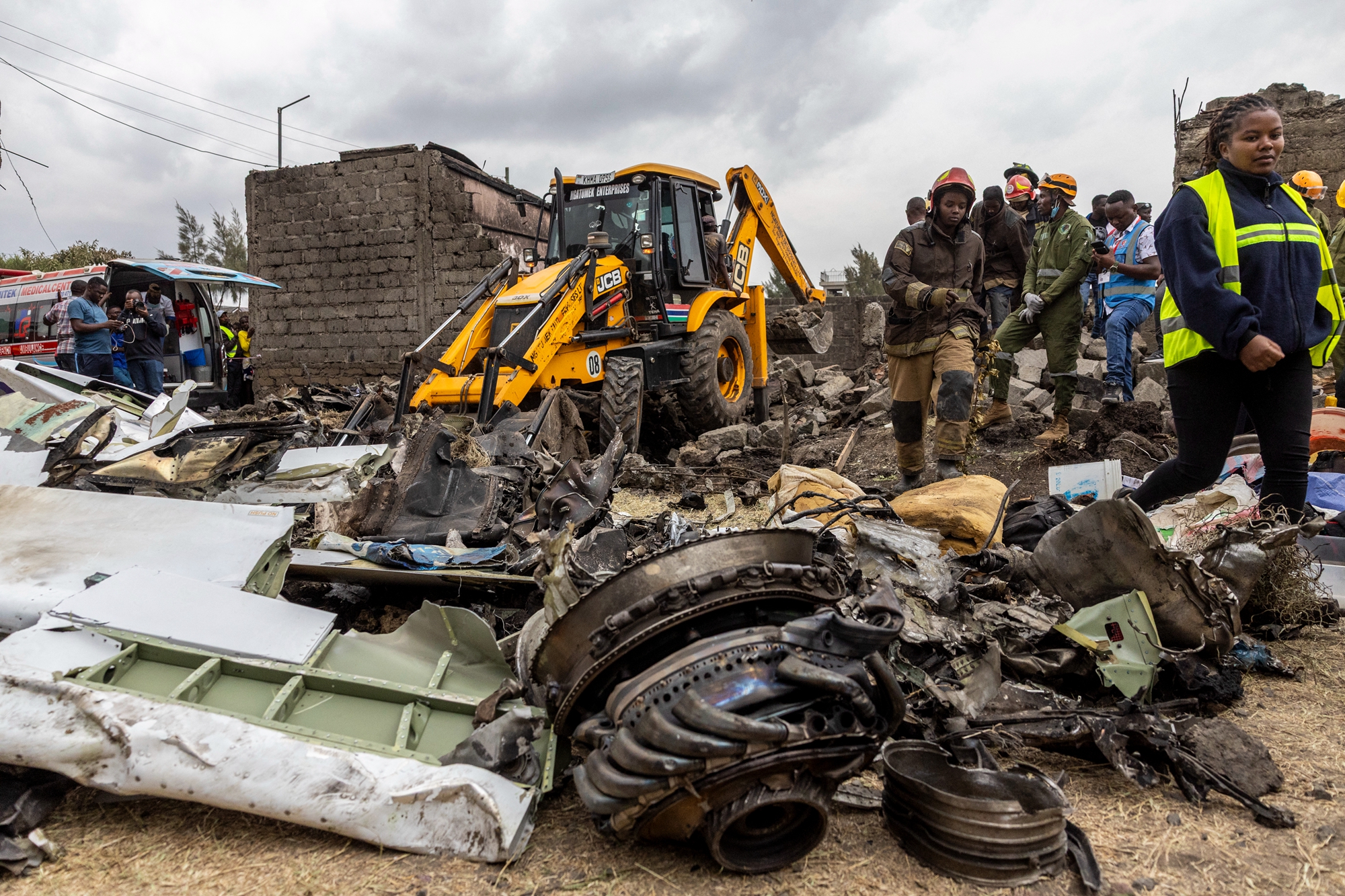 2025年8月7日,一架轻型医疗飞机在肯尼亚首都内罗毕近郊的一处居民区坠毁,救援人员在现场开展救援和善后工作。(Simon Maina/AFP via Getty Images)