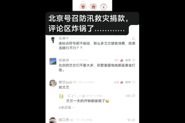 8月8日,北京因怀柔、密云水灾号召捐款,结果评论区没有出意外,评论的小船说翻就翻,满屏都是“杨兰兰捐了多少!”“找杨兰兰,这样的人北京最多。”“连标点符号都不能信!”“兰兰一天的开销都够了。”“那么多兰兰替我消费,给条活路行不行?”(链接)