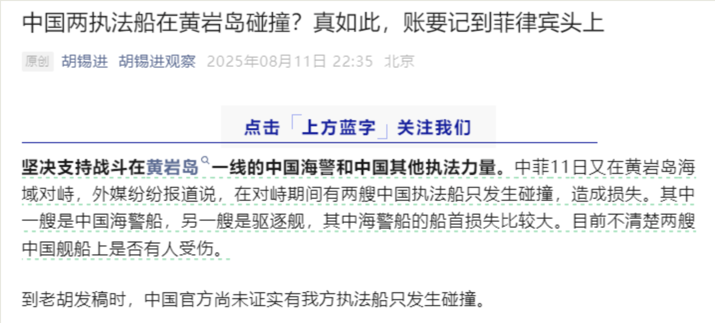 网传的截图显示,经常在社交媒体为中共站台的《环球时报》前总编胡锡进8月11日深夜发文《中国两执法船在黄岩岛碰撞?真如此,帐要算到菲律宾头上》。胡锡进在文中引用了外媒报导的中共海警船与自家军舰碰撞的消息,并称“中国官方尚未证实有我方执法船只发生碰撞”。
