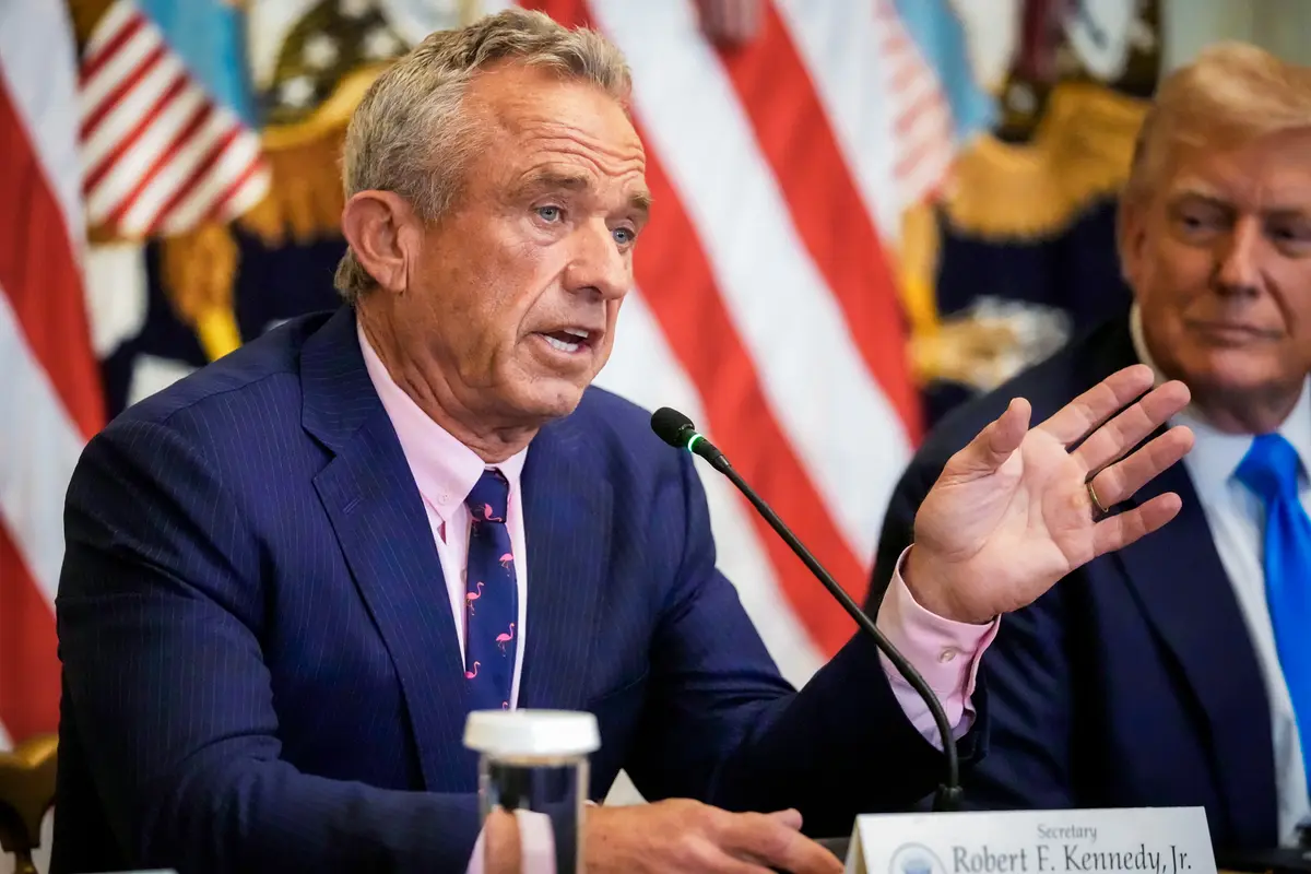 2025年7月30日,在白宫举行的一场活动中,卫生部长小罗伯特‧肯尼迪发表讲话,总统唐纳德‧川普(特朗普)聆听其关于改善美国人获取医疗记录途径的提案。(Mark Schiefelbein/AP Photo)