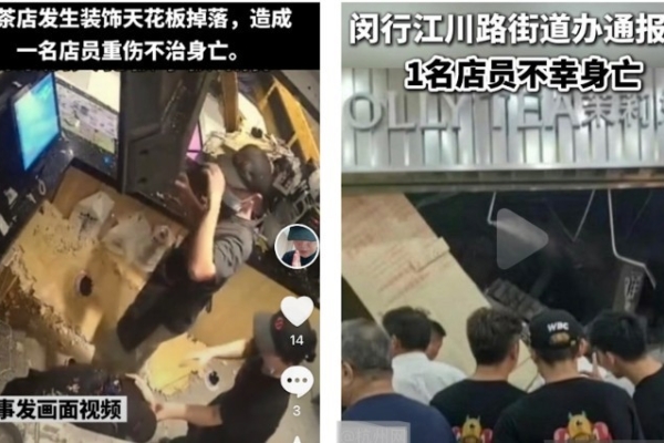 【大纪元2025年08月17日讯】(大纪元记者张钟元采访报导)8月15日晚,位于上海闵行金悦乐方店内,知名网红奶茶连锁品牌茉莉奶白门店发生装饰天花板掉落,致1名店员身亡。当时店里正在开展为期三天“买一送一”活动,没想到活动首日就以悲剧收场。