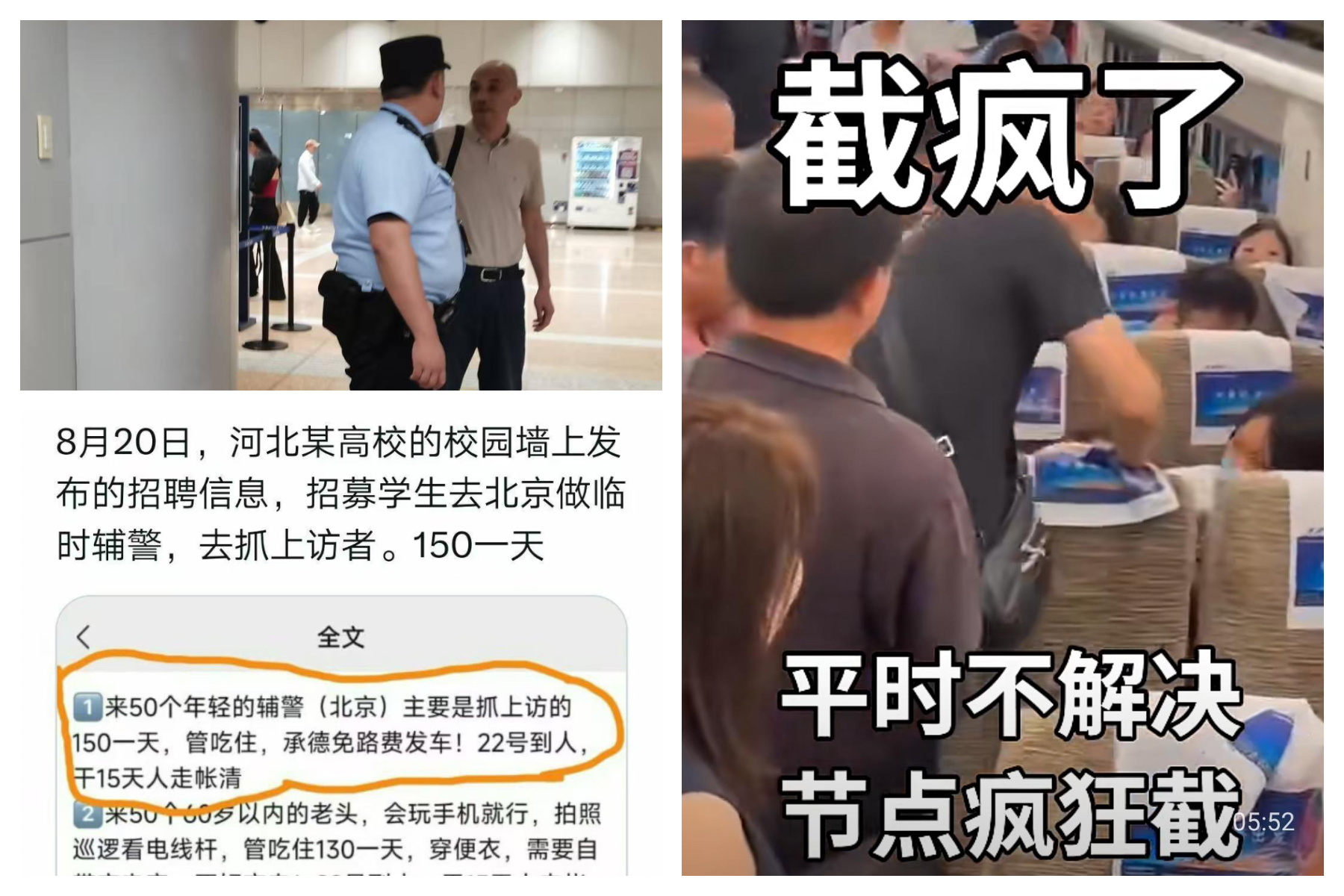 北京当局为了加大力度截访,近日公开招募大量临时保安人员。河北某高校校内出现招募公告,学生去北京做临时辅警,负责抓访民,一天150元管吃住。还有会玩手机负责拍照看电线杆、男女保安等各数十名,8月22日上工,为期15天。