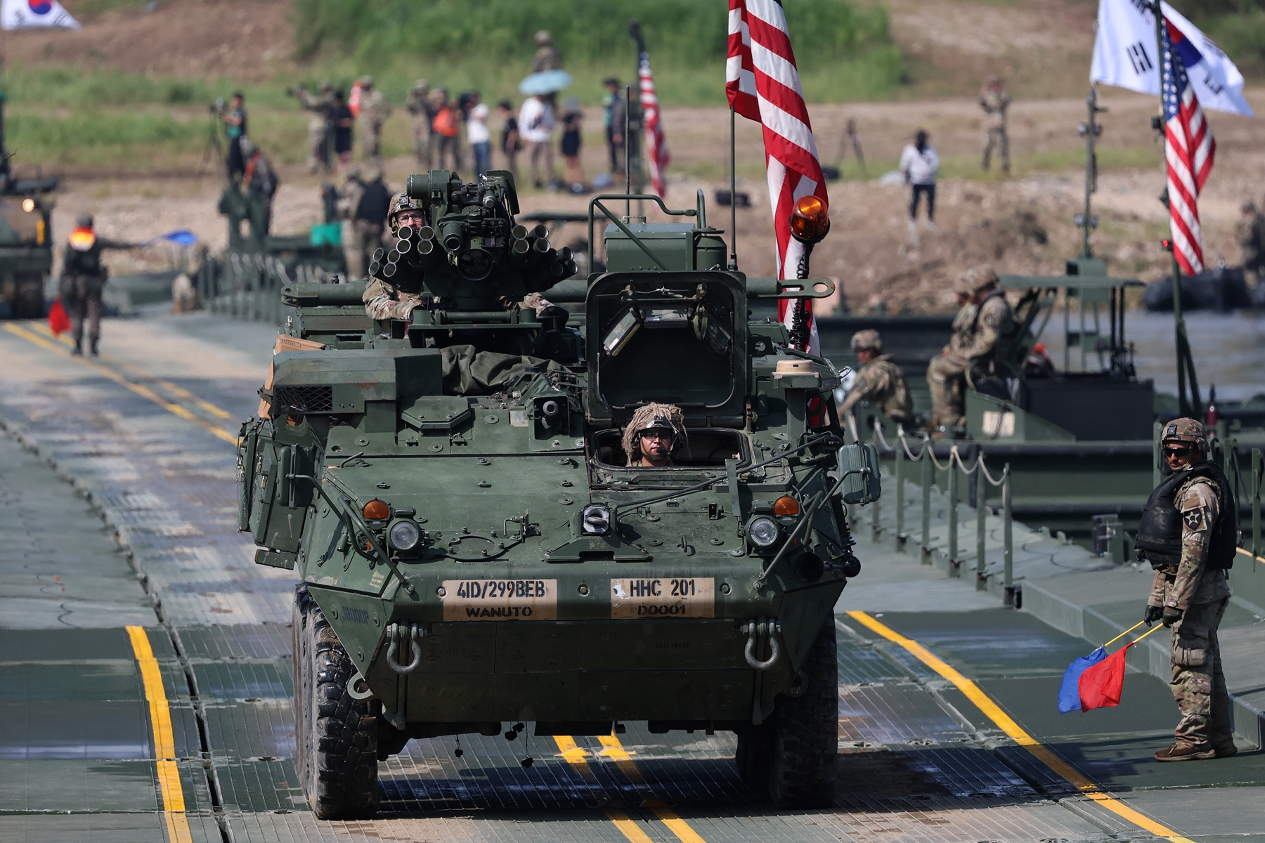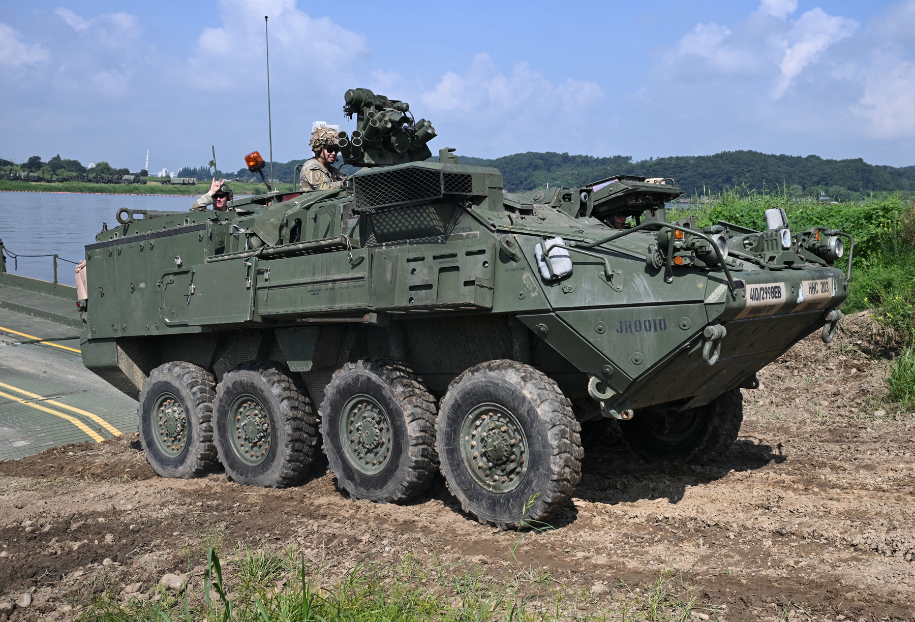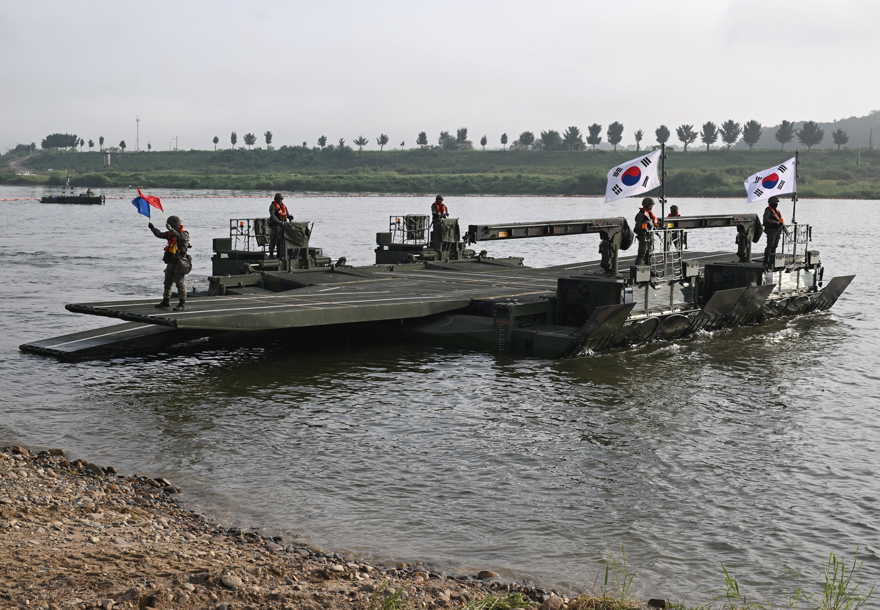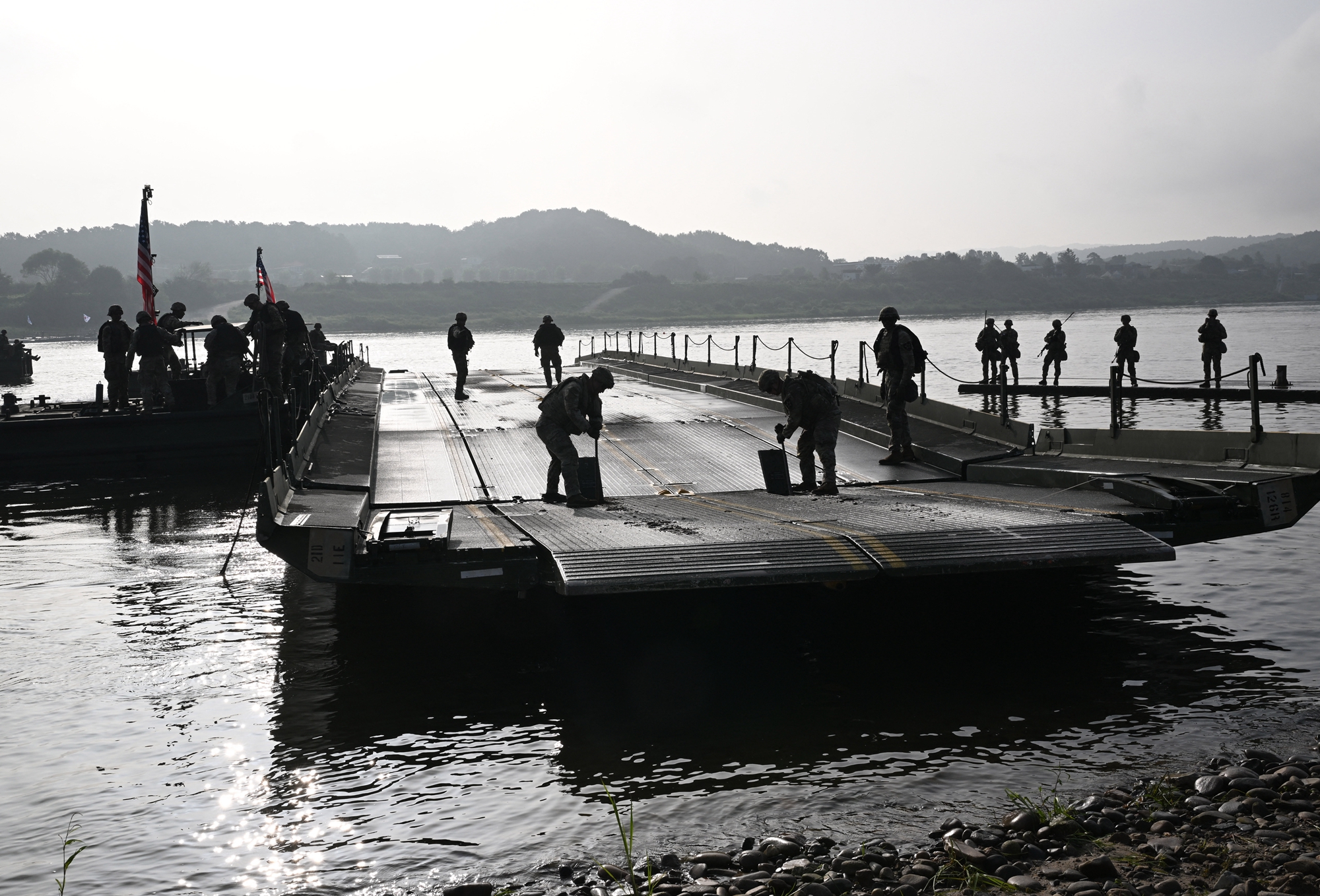 周三(27日),大约300名美韩军人以及包括美军为21世纪战场设计的新式八轮装甲车史崔克(Stryker)在内的150辆军用车辆参与了此次渡河演练。韩国的水陆两栖浮桥系统等设施也投入演习,其中一项关键任务是快速架设一座280米长的浮桥,以便让军事装备和人员安全通过。
