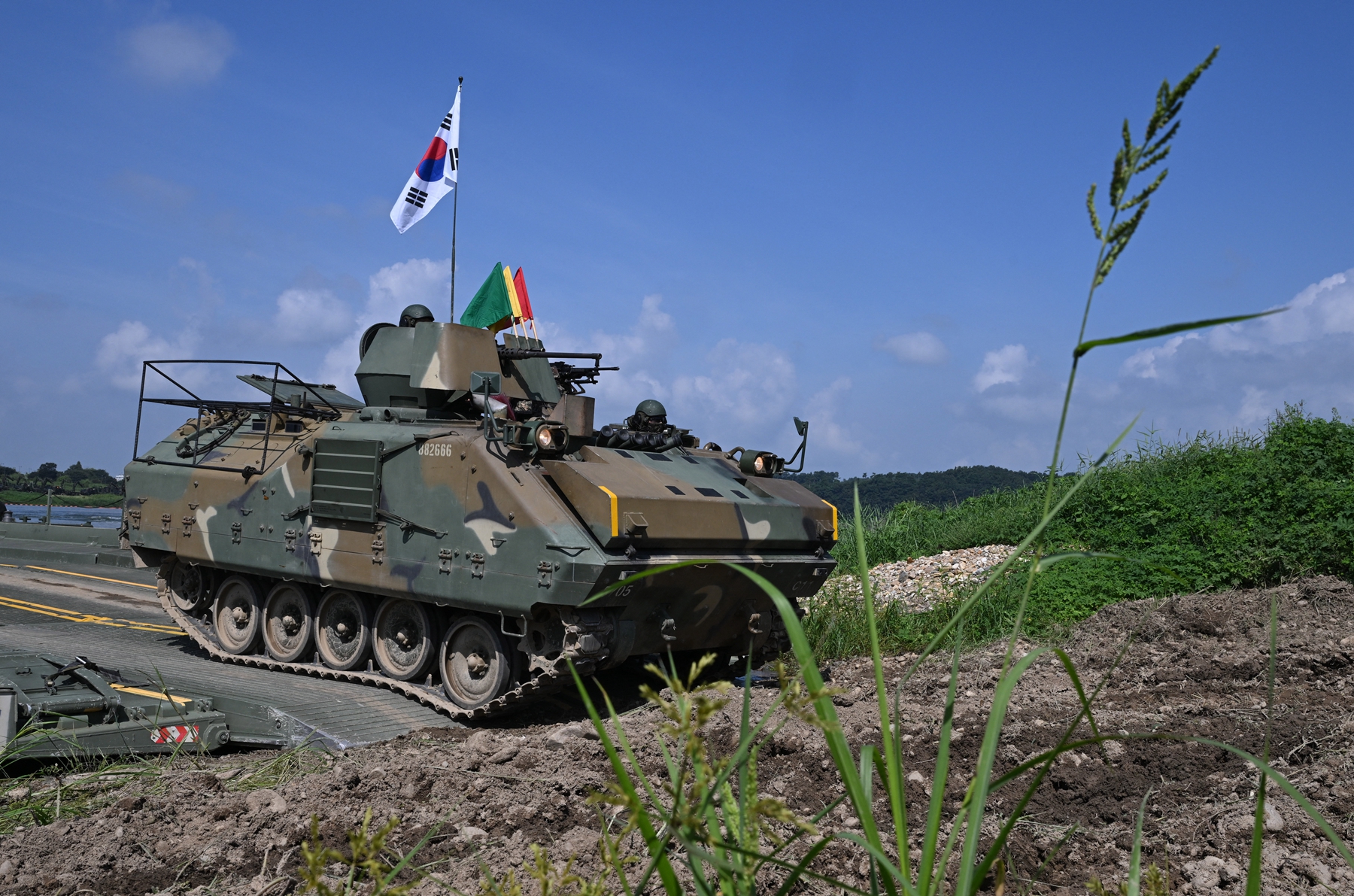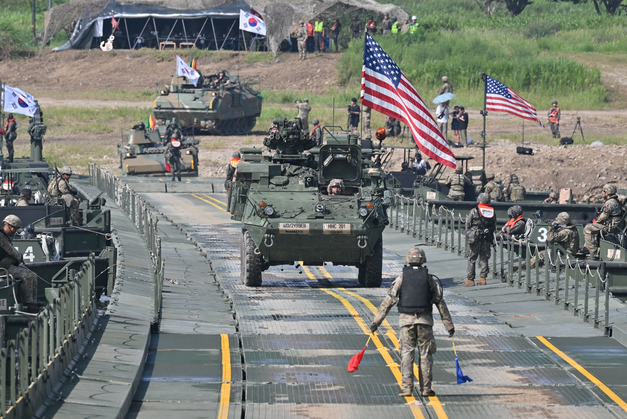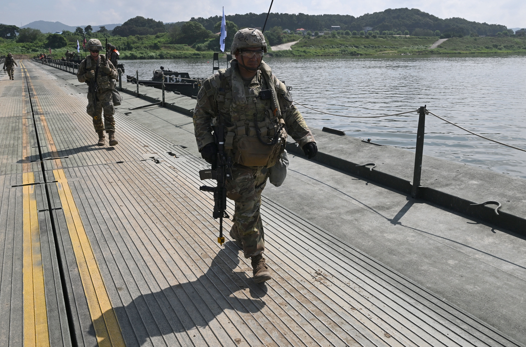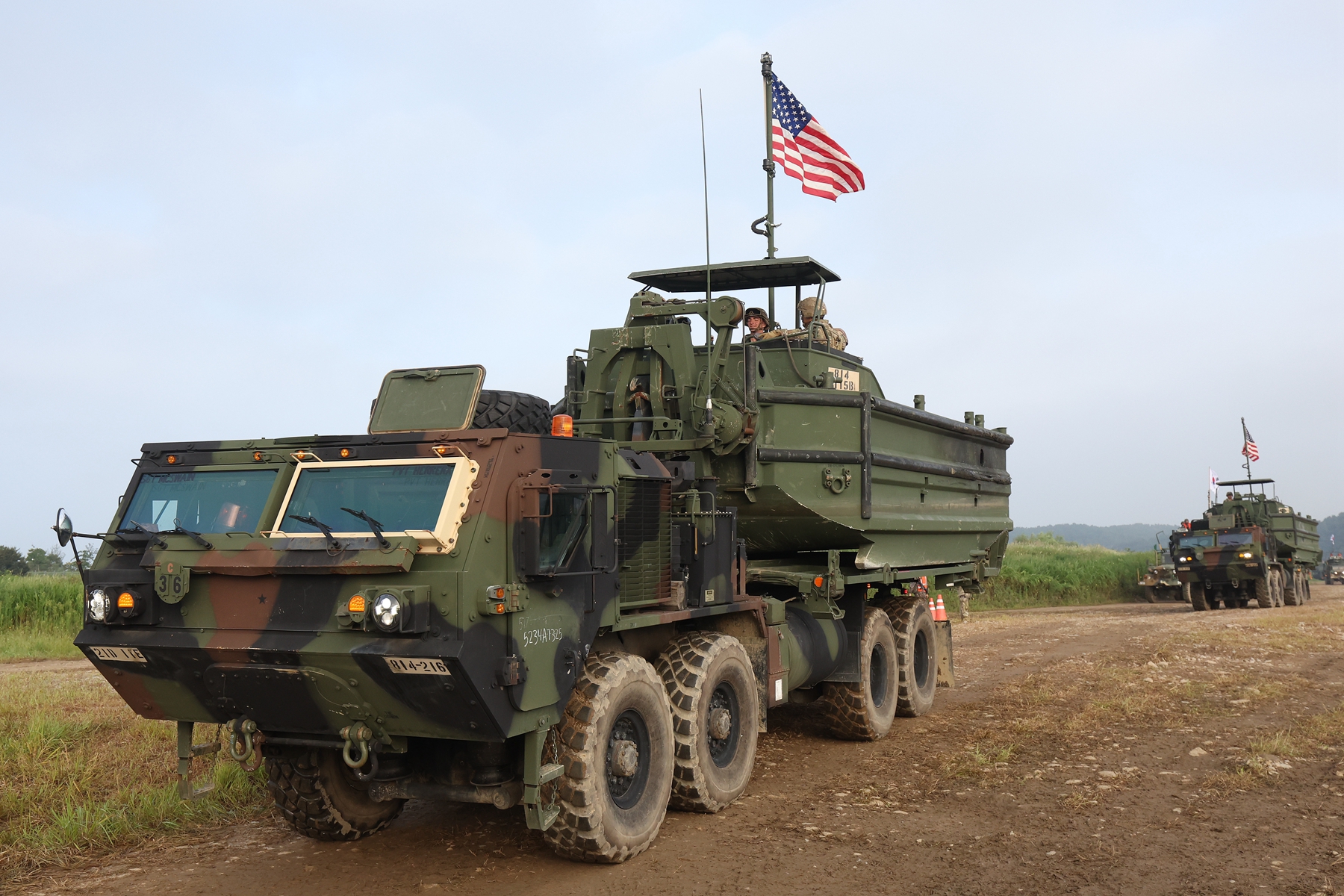 周三(27日),大约300名美韩军人以及包括美军为21世纪战场设计的新式八轮装甲车史崔克(Stryker)在内的150辆军用车辆参与了此次渡河演练。韩国的水陆两栖浮桥系统等设施也投入演习,其中一项关键任务是快速架设一座280米长的浮桥,以便让军事装备和人员安全通过。
