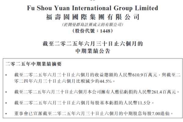 福寿园发布的《截至二零二五年六月三十日止六个月的中期业绩公告》显示,2025年上半年,福寿园实现营收约6.11亿元,同比下降44.5%,净利润亏损额达2.61亿元,去年同期为盈利2.98亿元。