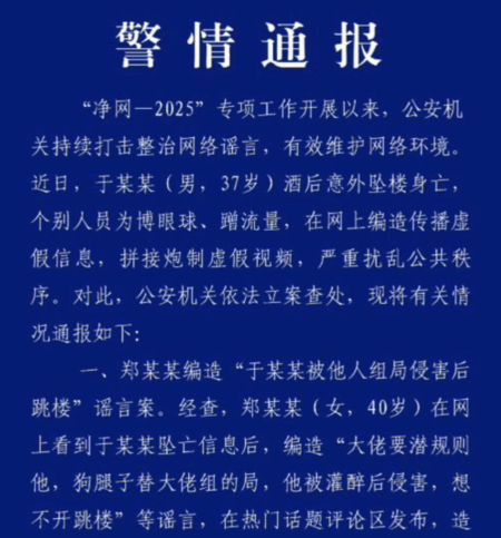 9月21日,北京警方首次发布相关通报,重申于朦胧系“酒后意外坠楼”,并称已对3名“编造传播谣言”的人员采取强制措施。通报强调,调查结果已获家属认可,于朦胧母亲通过工作室声明表达无异议。