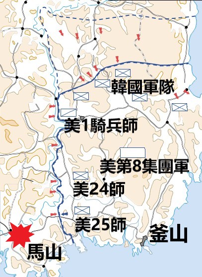 美军第8集团军的第24步兵师于7月初全部抵达韩国,第1骑兵师和第25步兵师分别于7月14日至18日抵达。在前期的阻击战中,美军减员超过6,000人,但随着不断增援,8月初美军在韩国境内的地面部队达到了约4.7万人。