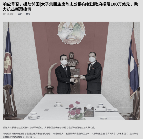 据太子集团官网消息,2021年9月,柬埔寨总理洪森的顾问、太子集团主席陈志公爵向老挝捐赠20万剂中国生产的科兴疫苗,同时向老挝政府捐赠了100万美元。这是陈志跟随洪森出访老挝时对老挝的援助。(太子集团官网截图)