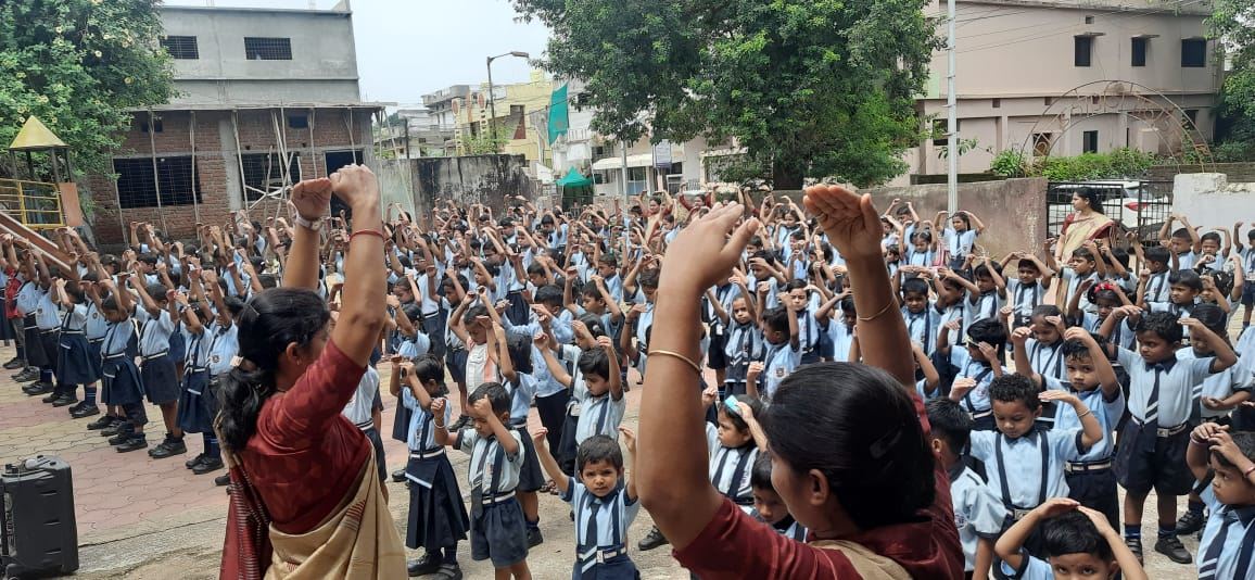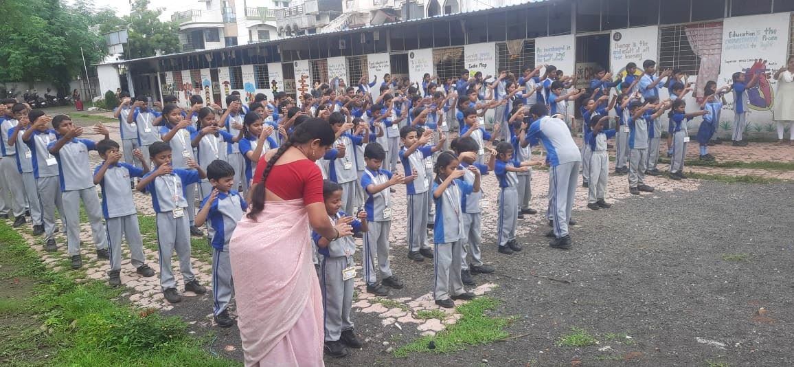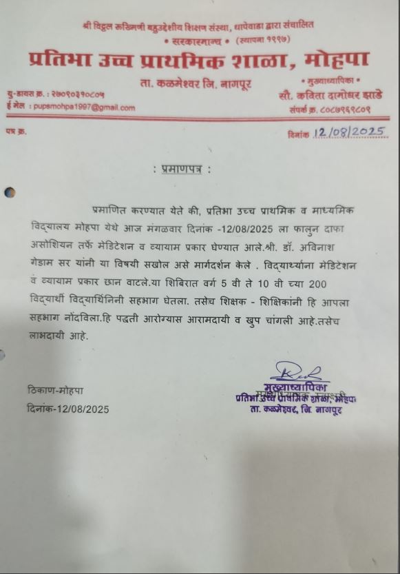 “兹证明,2025年8月12日,星期二,阿维纳什﹒格达姆博士(Dr. Avinash Gedam)和法轮大法学员在莫赫帕的普拉蒂巴高级小学与中学教法轮大法功法。