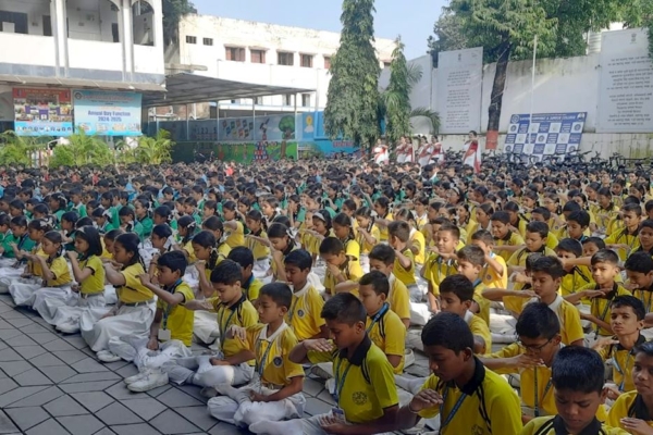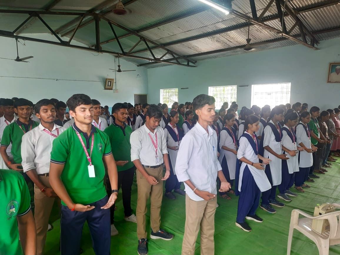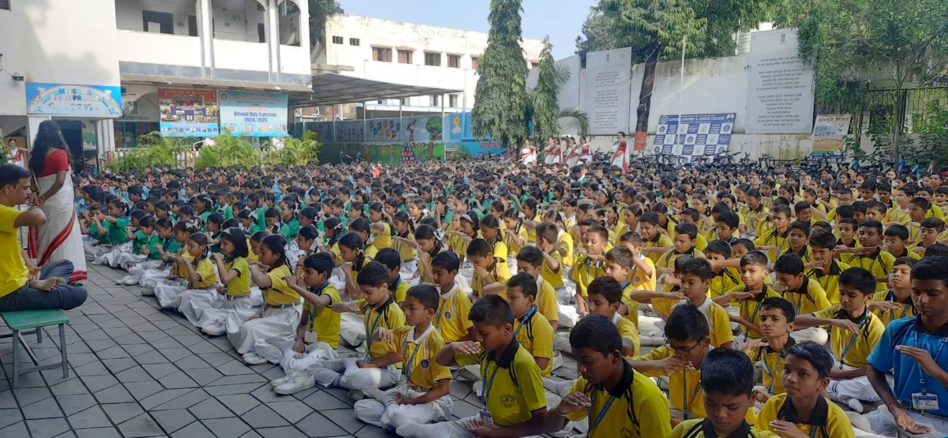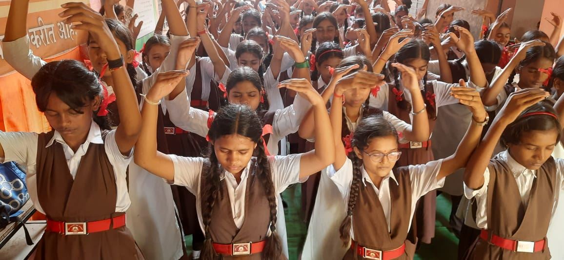 施里玛蒂﹒达迪拜﹒戴施穆克印度女子学校(Shrimati Dadibai Deshmukh Hindu Girls School)的学生们在专心地打坐。(明慧网)