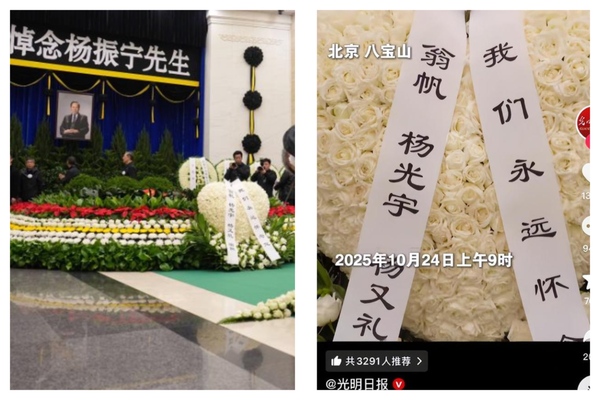 【大纪元2025年10月27日讯】(大纪元记者夏松报导)10月24日,著名物理学家、诺贝尔物理学奖得主、清华大学教授杨振宁的葬礼在北京举行。外界发现,其长子杨光诺未现身,挽联署名仅有翁帆,及杨振宁的二儿子、女儿。据报,杨光诺已于2024年底离世,终年73岁,更有消息指,杨光诺去年在深圳做了器官移植手术,之后出现排异,最终死在美国家中。