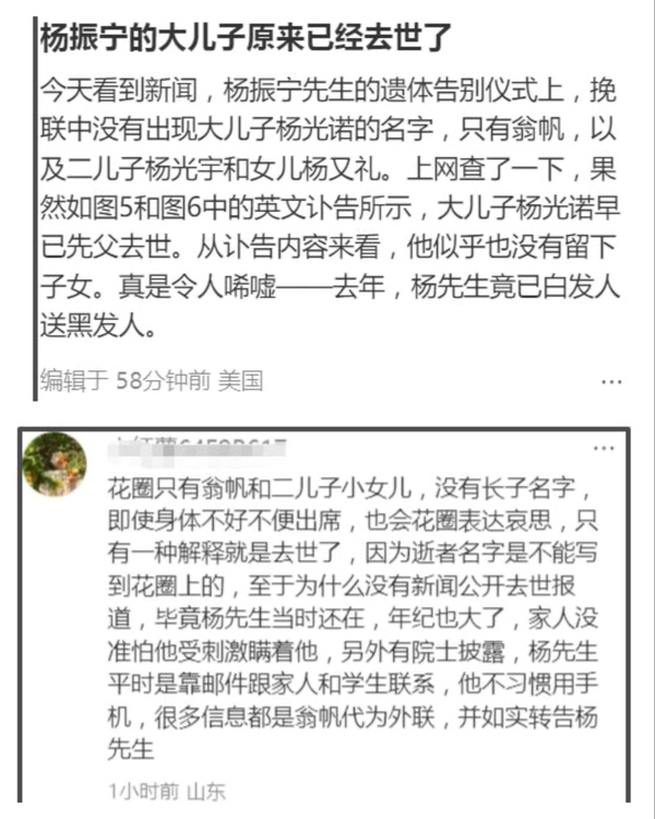 随即,杨振宁的长子杨光诺已在2024年年底去世的消息传开。