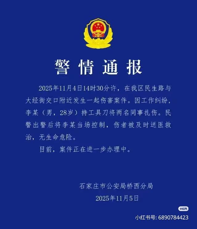 11月5日上午河北石家庄市公安局桥西分局发布警情通报称,“11月4日14时30分许,在我区民生路与大经街交口附近发生一起伤害案件。因工作纠纷,李某(男,28岁)持工具刀将两名同事扎伤。民警出警后将李某当场控制,伤者被及时送医救治,无生命危险。目前,案件正在进一步办理中。”