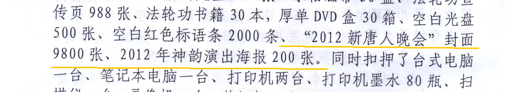 河北泊头市法院2012年的一份判决书显示,一名王姓法轮功学员被非法判刑三年。法庭文件上显示的证据中,除了法轮功书籍、“真、善、忍”挂图等,与神韵相关的证据包括《2012年新唐人晚会》光盘100张,《2012年新唐人晚会》封面9,800张、2012年神韵演出海报200张等。