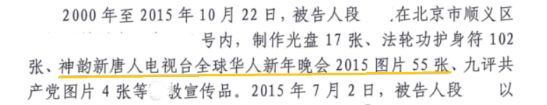 北京市顺义区法院2017年的一份判刑书显示,一名段姓法轮功学员被非法判刑一年半。法庭文件上显示的判决依据是,在2000年至2015年的15年间,该男子制作了17张法轮功光盘、55张新唐人电视台2015年新年晚会(即“神韵晚会”)图片、4张《九评共产党》图片,以及102个与法轮功相关的护身符。这些都成为了他被迫害的“罪证”。