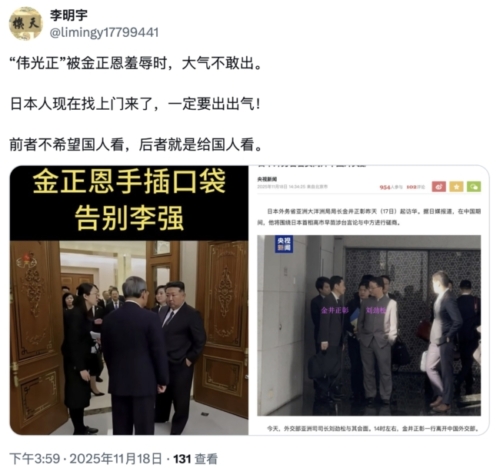 【大纪元2025年11月19日讯】(大纪元记者李净、骆亚采访报导)中日司局长级磋商昨天(18日)在北京举行,围绕日本首相高市早苗的涉台言论进行交涉。会后,中方官员刘劲松“双手插兜”送客的画面经官媒高调报导后,引发批评。专家分析认为,中共战狼姿态主要服务于国内宣传,但实际效果可能适得其反。