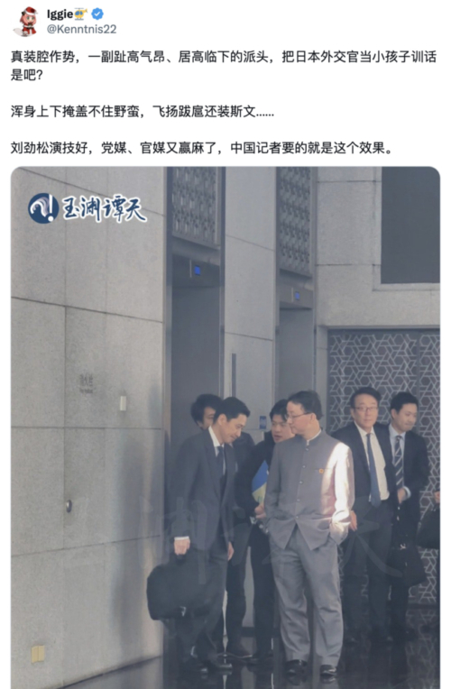 前中共中央党校教授蔡霞表示,日本高级外交官微微低头顾及后面正在做翻译的中方外交人员,一个低头细节充分展现日本外交官礼貌谦和尊重人的高度文明素养。而中共国外交部亚洲司司长刘劲松挺着肚子双手插在裤兜里,淋漓尽致地表露出中共党官员毫无文明教养的街头小痞子本相。