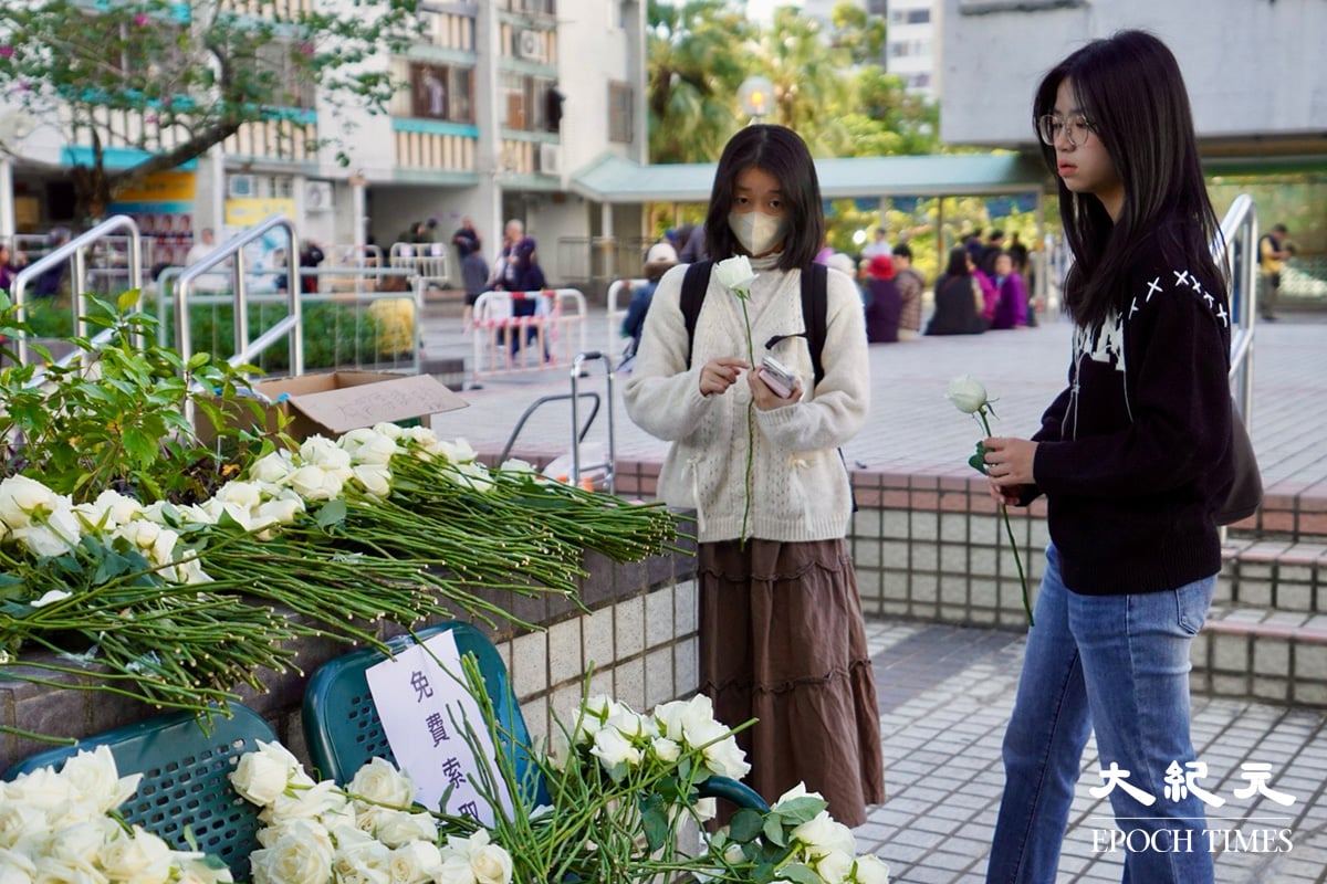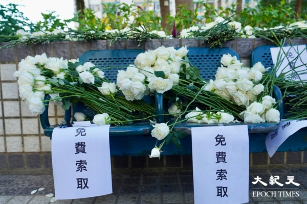 与宏福苑相邻的广福邨也有大量市民持白花、双手合十悼念,一旁有长椅上放满悼念用的白玫瑰,并留有字条“免费取用”。
