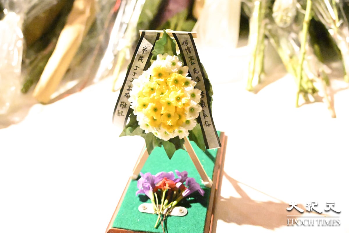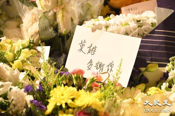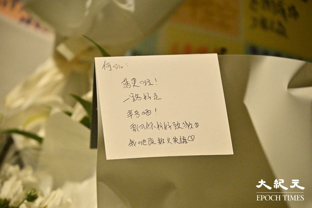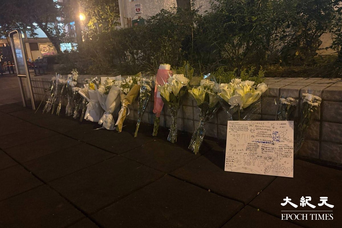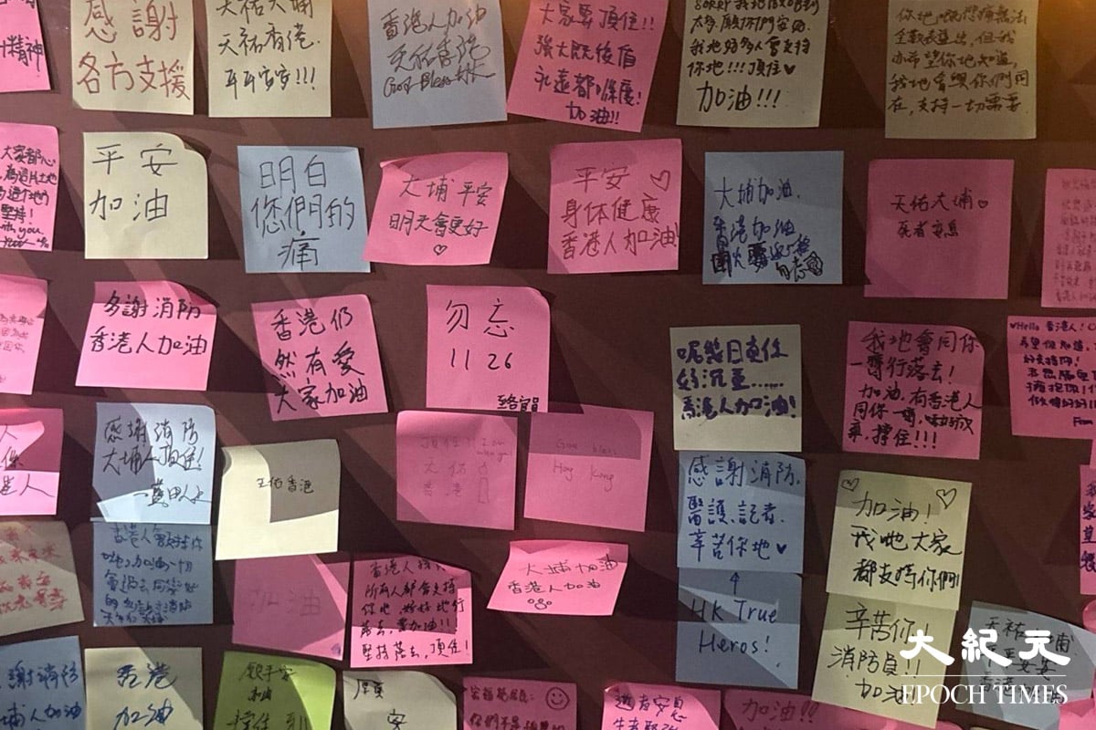 在宏福苑对面的广福休憩处,大批市民前来献花悼念,其中一个灯柱下放满花和悼念的卡片,有卡片写着“天佑(祐)大埔、天佑(祐)香港、逝者安息、生者坚强”。