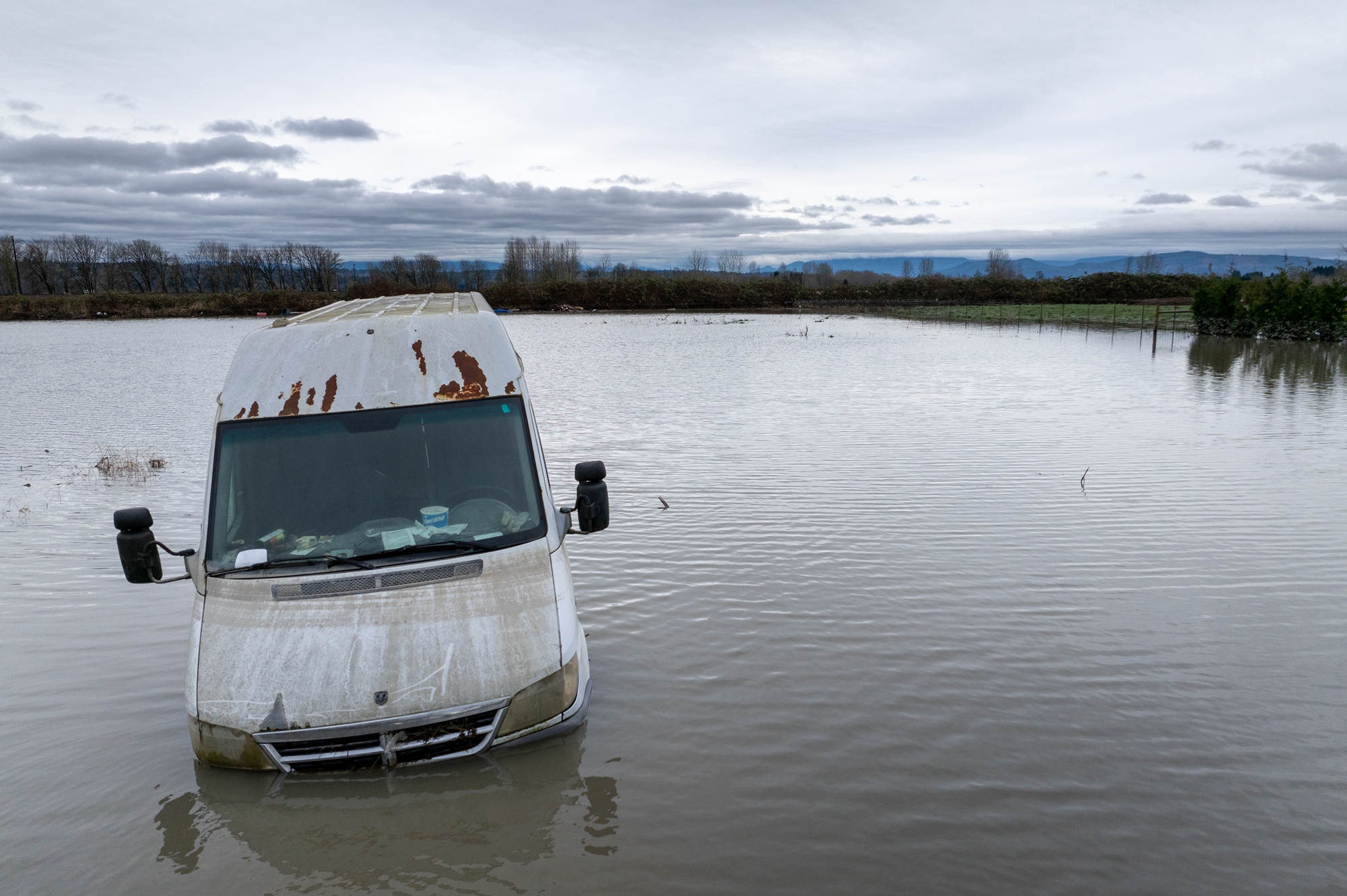 2025年12月14日,华盛顿州斯诺霍米什县发生严重洪涝灾害,一辆汽车浸泡在洪水中。(Brandon Bell/Getty Images)