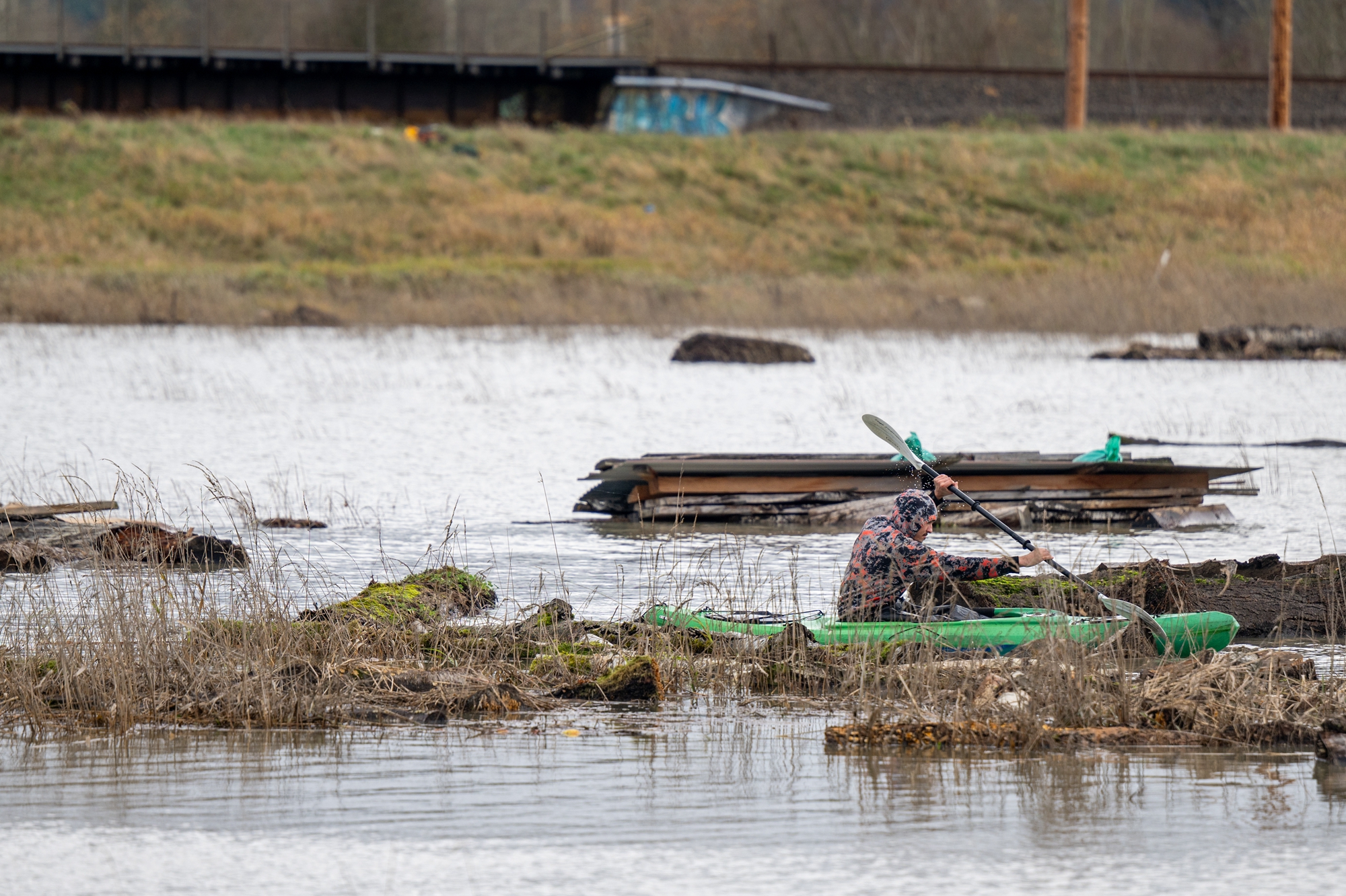 2025年12月14日,华盛顿州斯诺霍米什县发生严重洪涝灾害,一名男子划船出行。(Brandon Bell/Getty Images)
