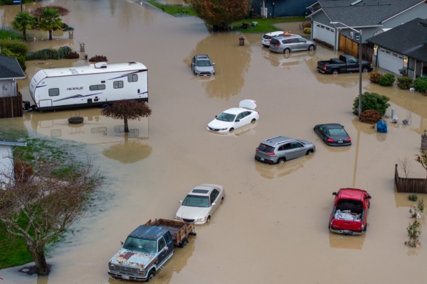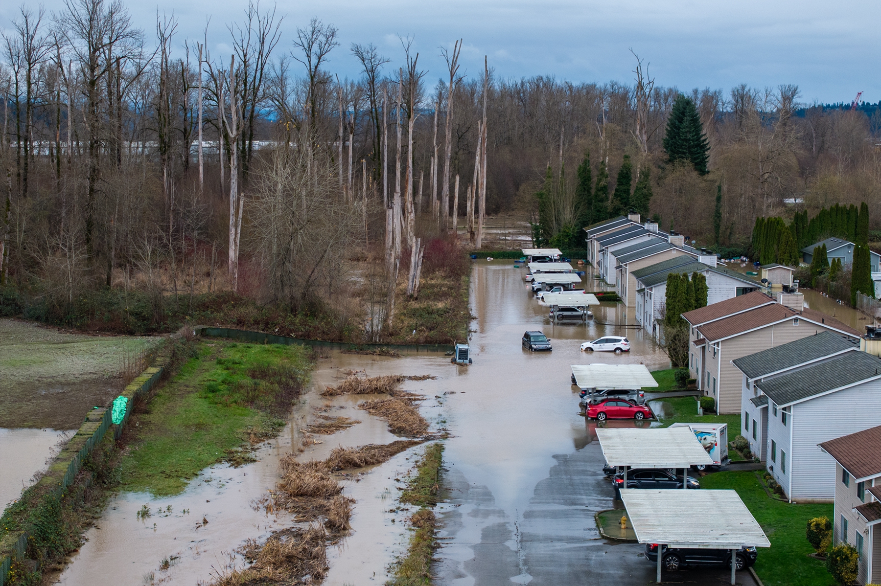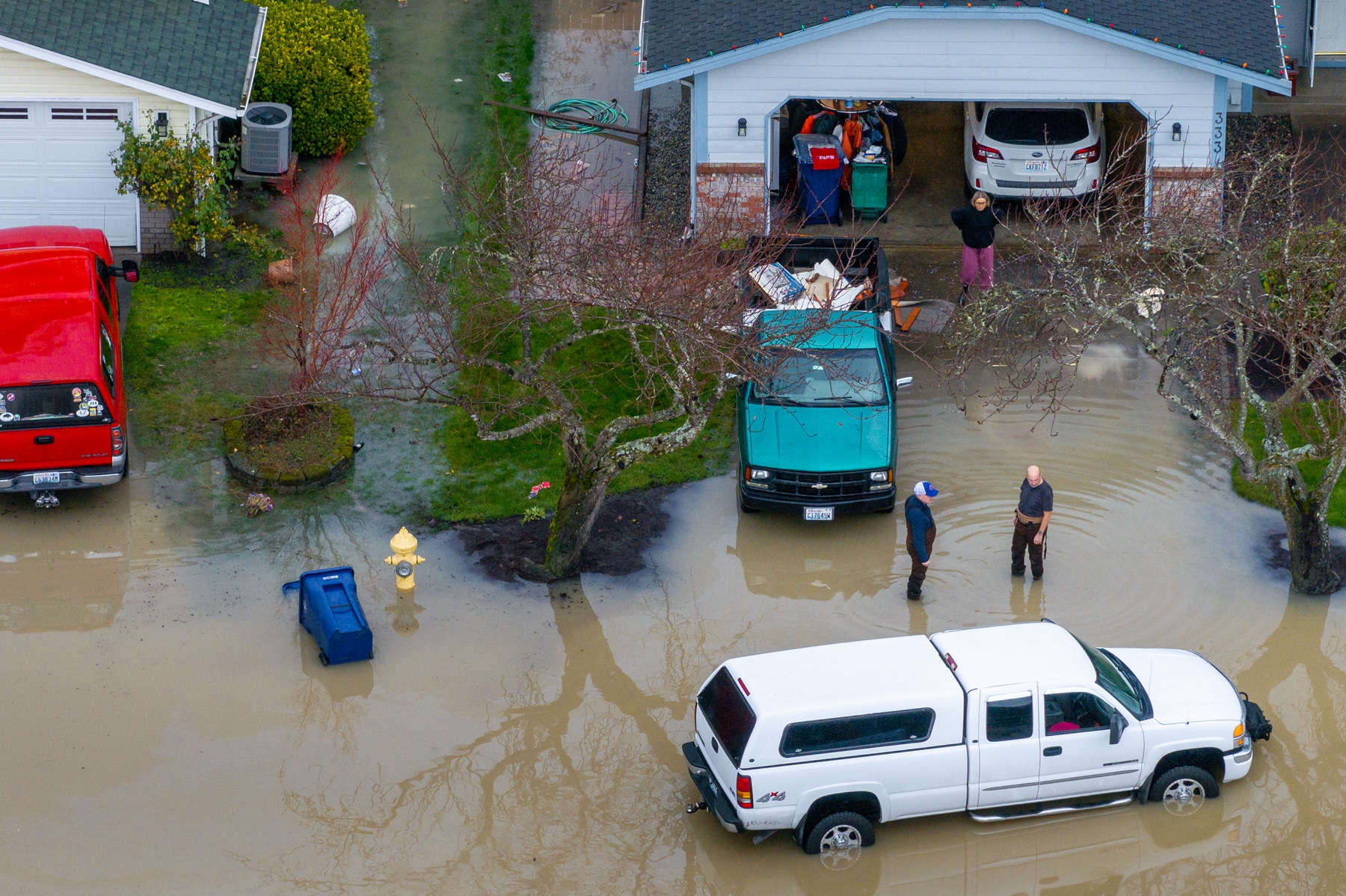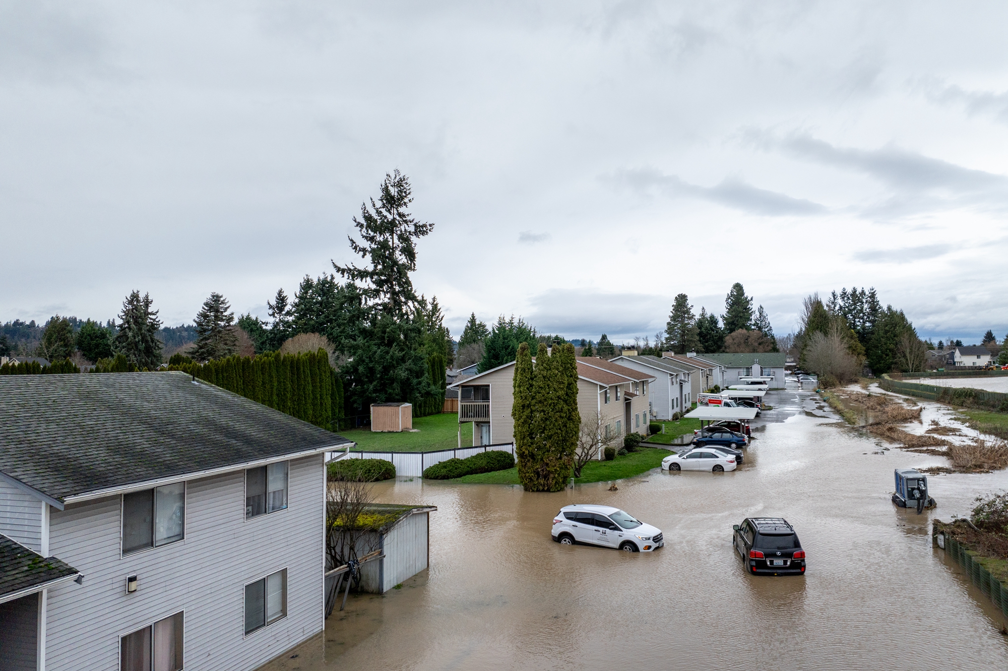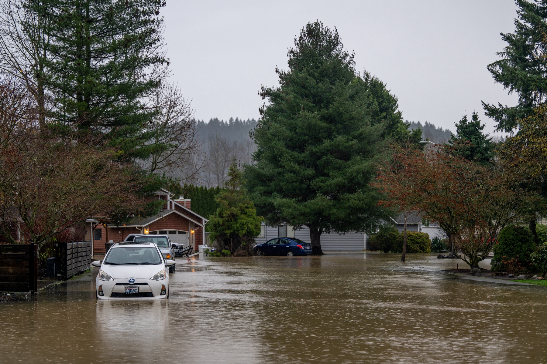 2025年12月16日,华盛顿州金县太平洋城的一个社区被洪水围困。(Brandon Bell/Getty Images)